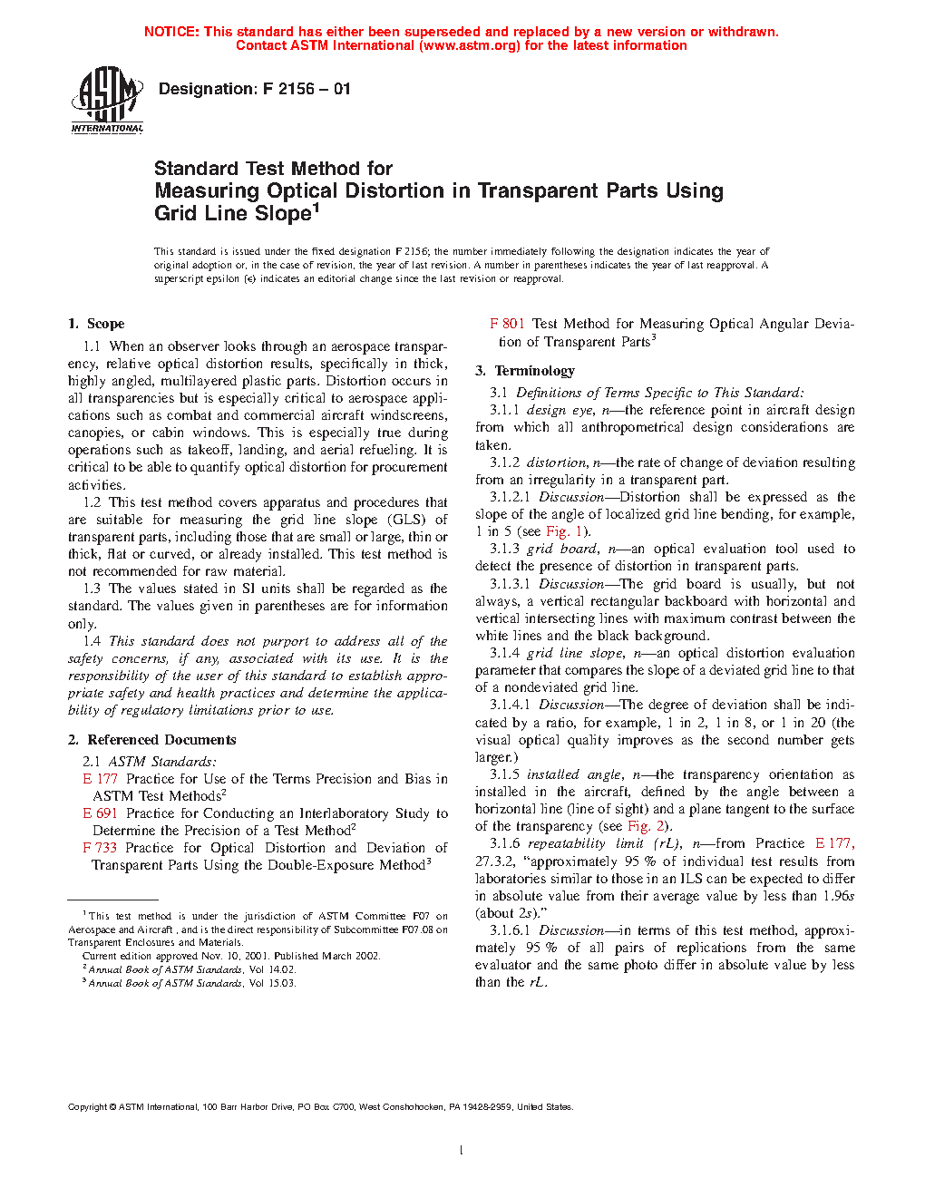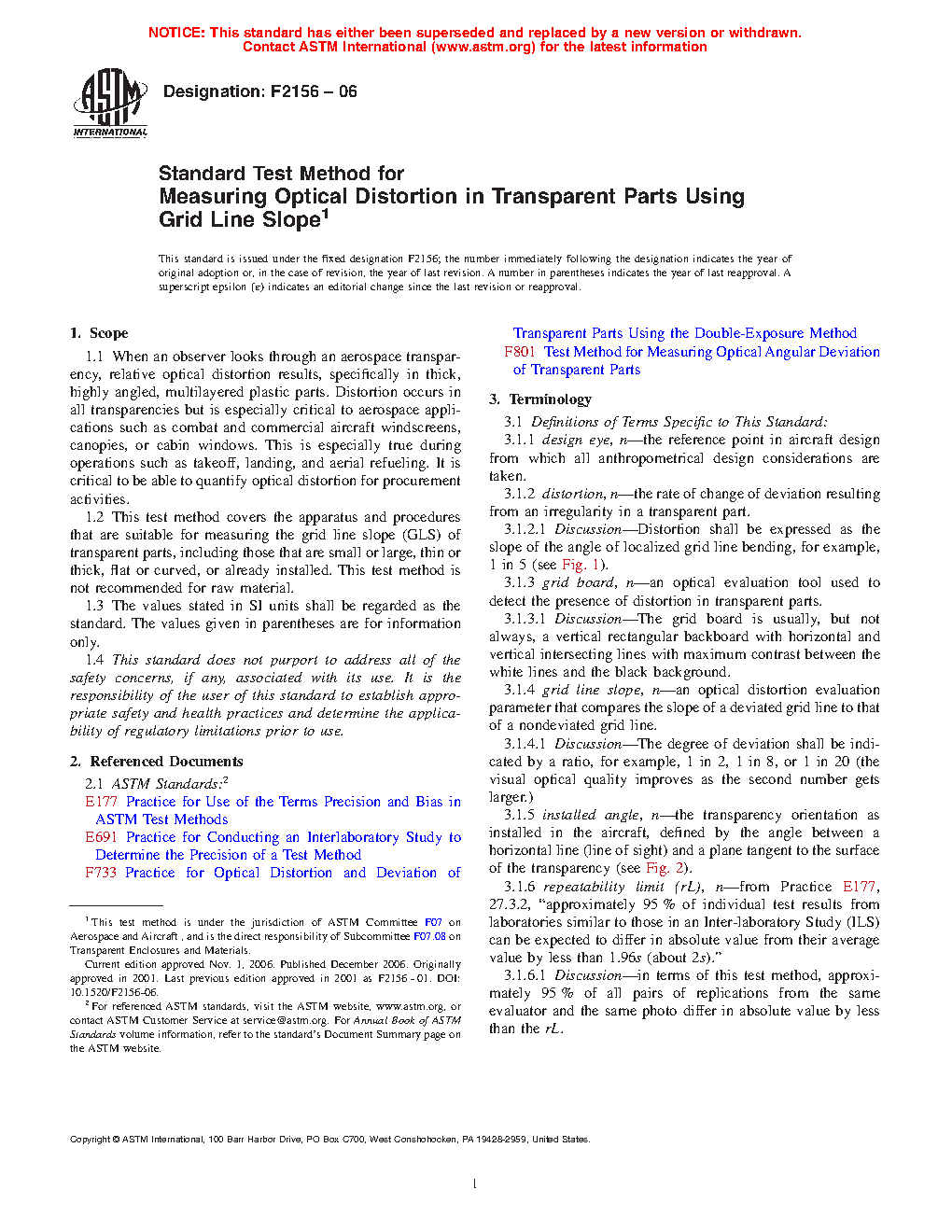 1.1 When an observer looks through an aerospace transparency, relative optical distortion results, specifically in thick, highly angled, multilayered plastic parts. Distortion occurs in all transparencies but is especially critical to aerospace applications such as combat and commercial aircraft windscreens, canopies, or cabin windows. This is especially true during operations such as takeoff, landing, and aerial refueling. It is critical to be able to quantify optical distortion for procurement activities.