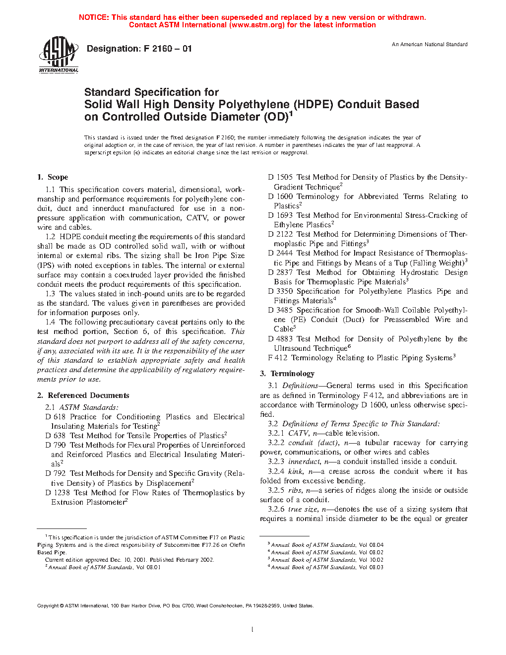 1.1 This specification covers material, dimensional, workmanship and performance requirements for polyethylene conduit, duct and innerduct manufactured for use in a non- pressure application with communication, CATV, or power wire and cables.