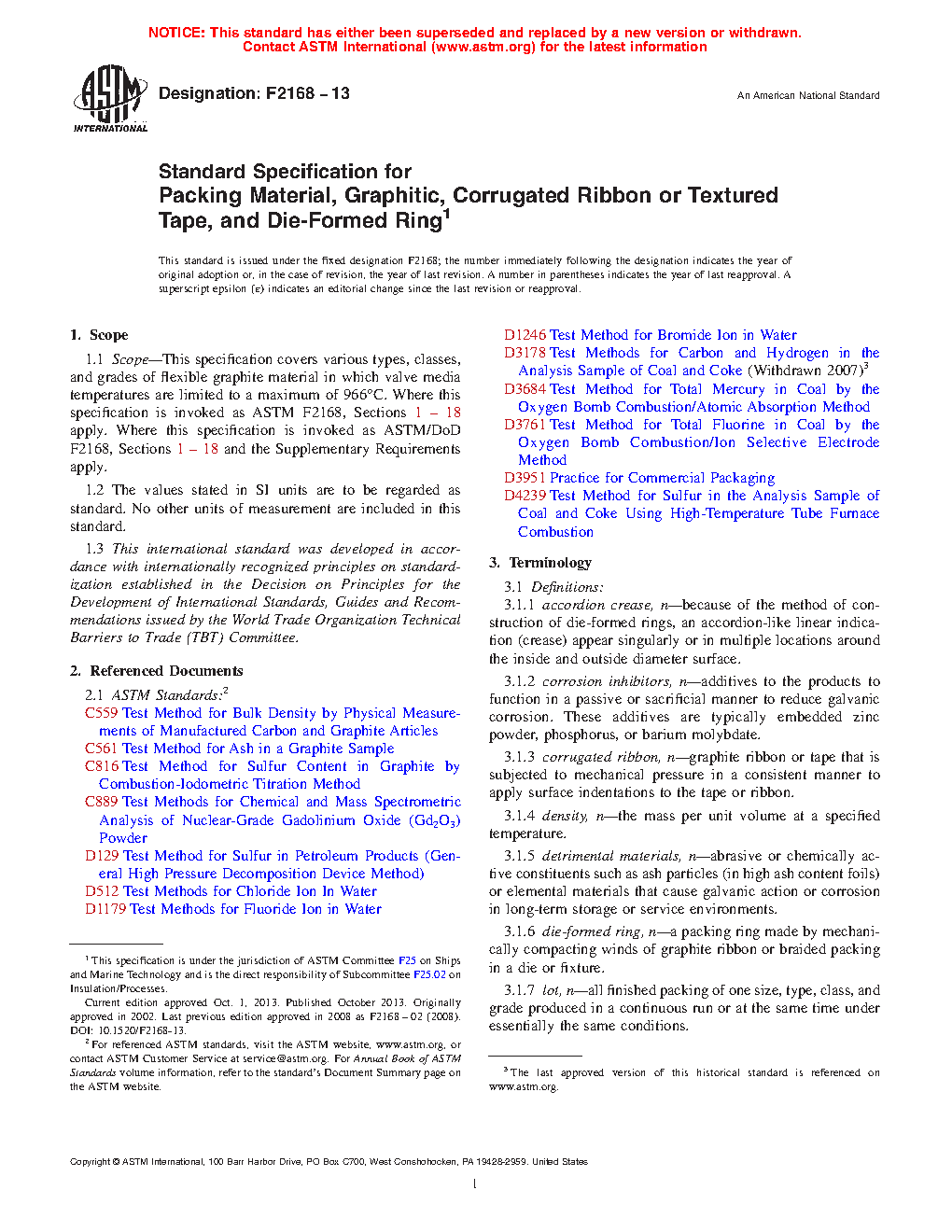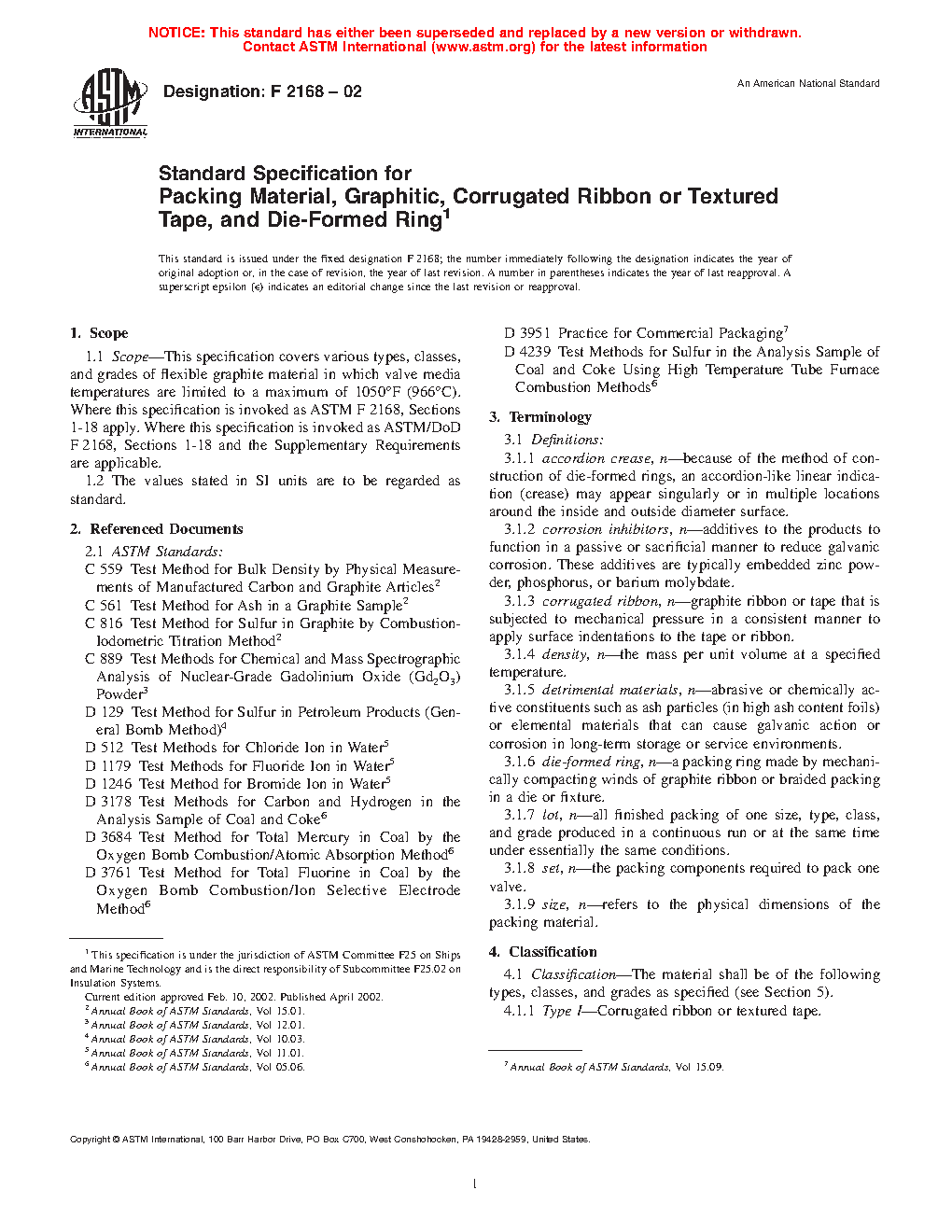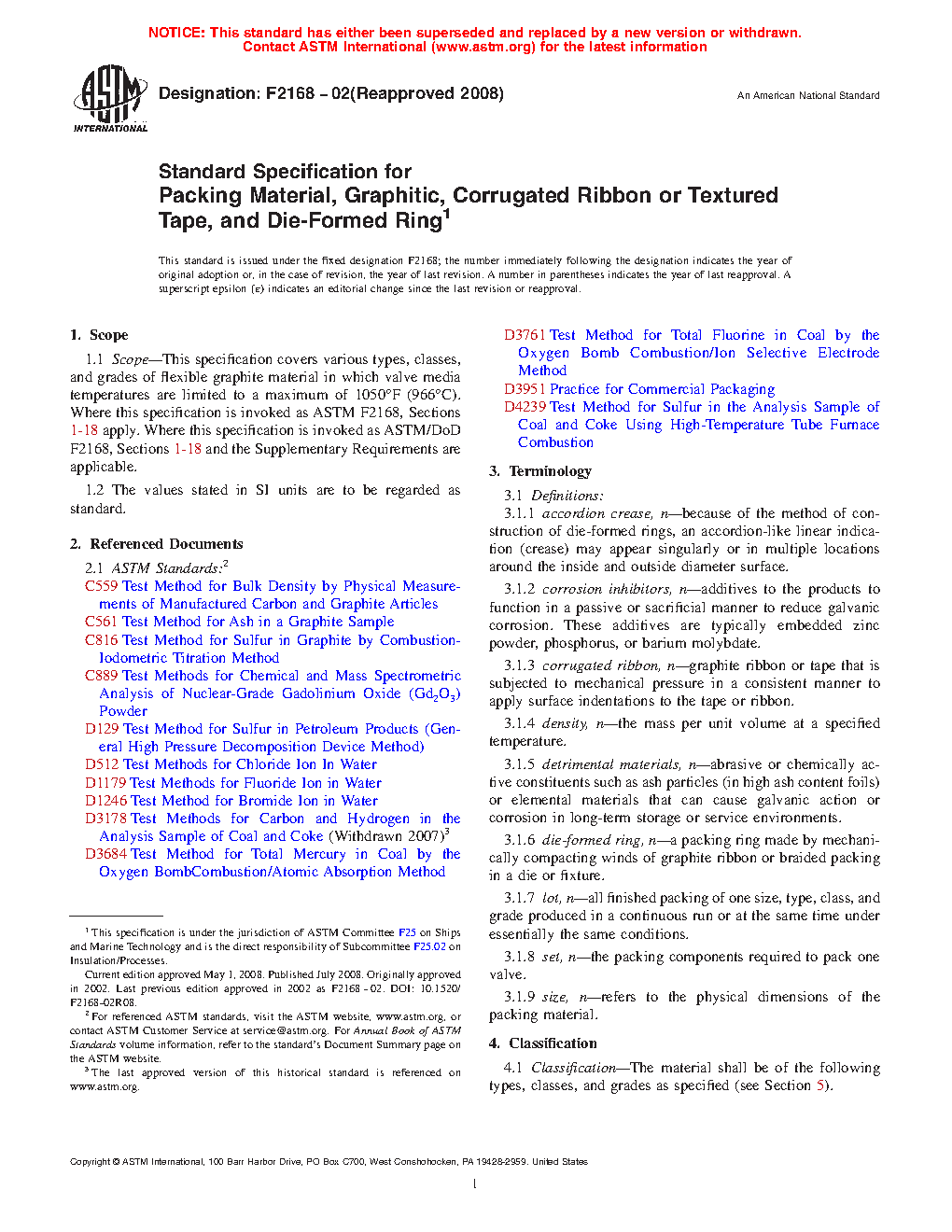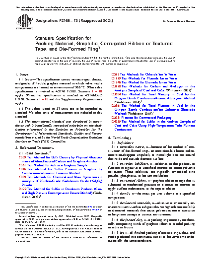 1.1 Scope—This specification covers various types, classes, and grades of flexible graphite material in which valve media temperatures are limited to a maximum of 966 °C. Where this specification is invoked as ASTM F2168, Sections 1 – 18 apply. Where this specification is invoked as ASTM/DoD F2168, Sections 1 – 18 and the Supplementary Requirements apply.