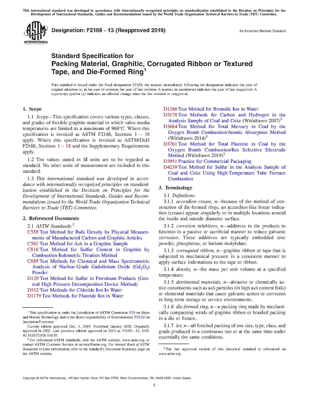 This specification covers various types, classes, and grades of flexible graphite material in which valve media temperatures are limited to a maximum temperature. The material shall be classified into two types, classes, and grades. Type I is a corrugated ribbon or textured tape, Type II is die-formed ring. Class 1 is for use where detrimental material content of the packing need not be controlled beyond normal manufacturing limit and Class 2 is for use where detrimental material content must be controlled to the limits specified herein. Grade A is treated with corrosion inhibitor and Grade B not treated with corrosion inhibitor. Different tests and measurements shall be conducted in order to determine the following properties: size, bulk density, ash content, and graphite purity.