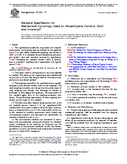 This specification establishes requirements for the qualification of mechanical couplings of particular range of sizes that connect to particular types of polyethylene conduit, duct and innerduct. The couplings covered by this specification are typically designed to join between conduit ends (in-line coupling). The same coupling-to-conduit joint design may be used as a part of other coupling joint designs that telescope, or connect to bulkheads, or other adapter fitting designs. The requirements of this standard apply only to the coupling-to-conduit joint design. The performance requirements of other coupling joint designs are not a part of this standard. The couplings shall conform to the specified pressure and tensile strength requirements.