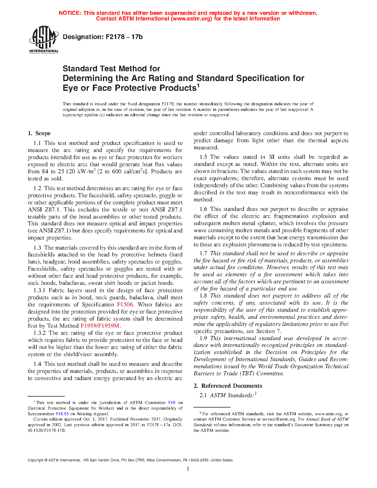 1.2.1 Fabric layers used in the design of face protection products such as in hood, neck guards, balaclava, meet the requirements of Specification F1506. When fabrics are designed into the protection provided for eye or face protective products, the arc rating of fabric system is first determined by Test Method F1959/F1959M.