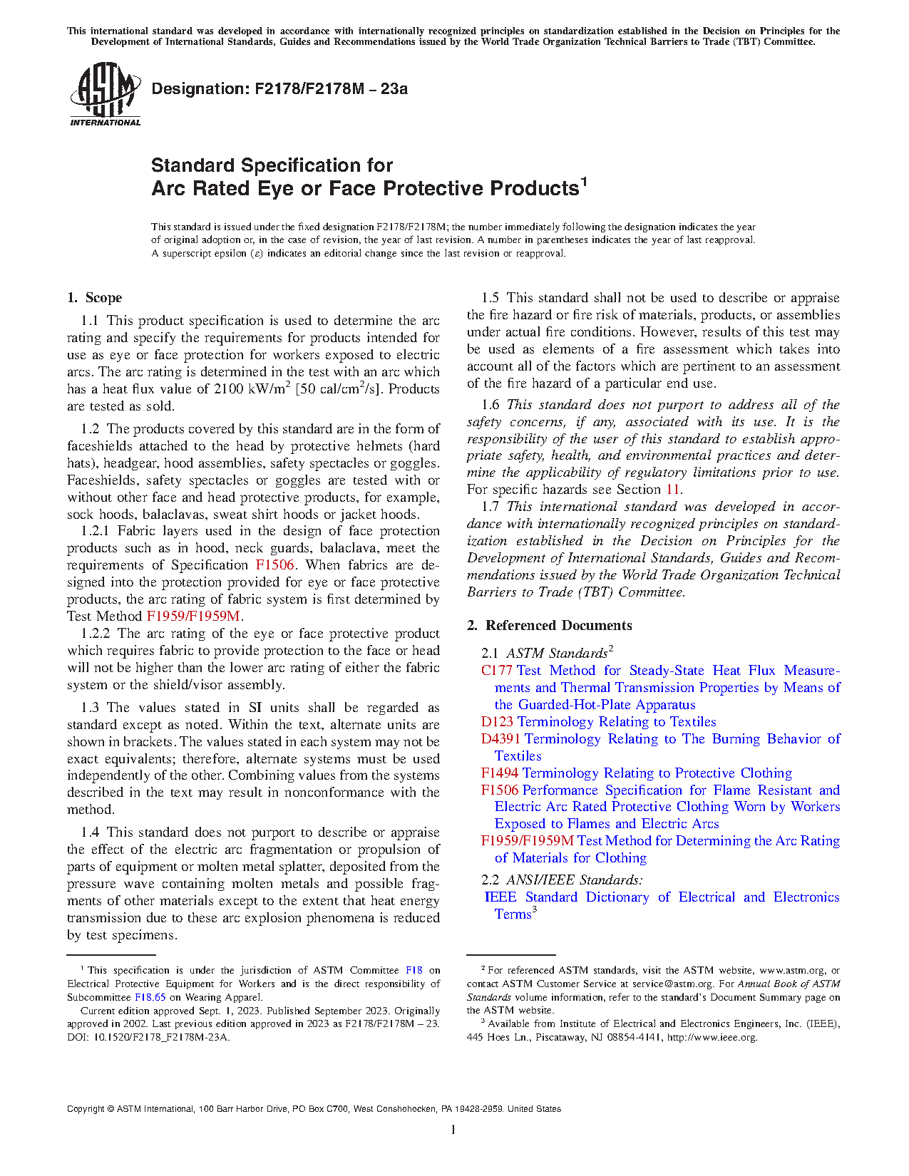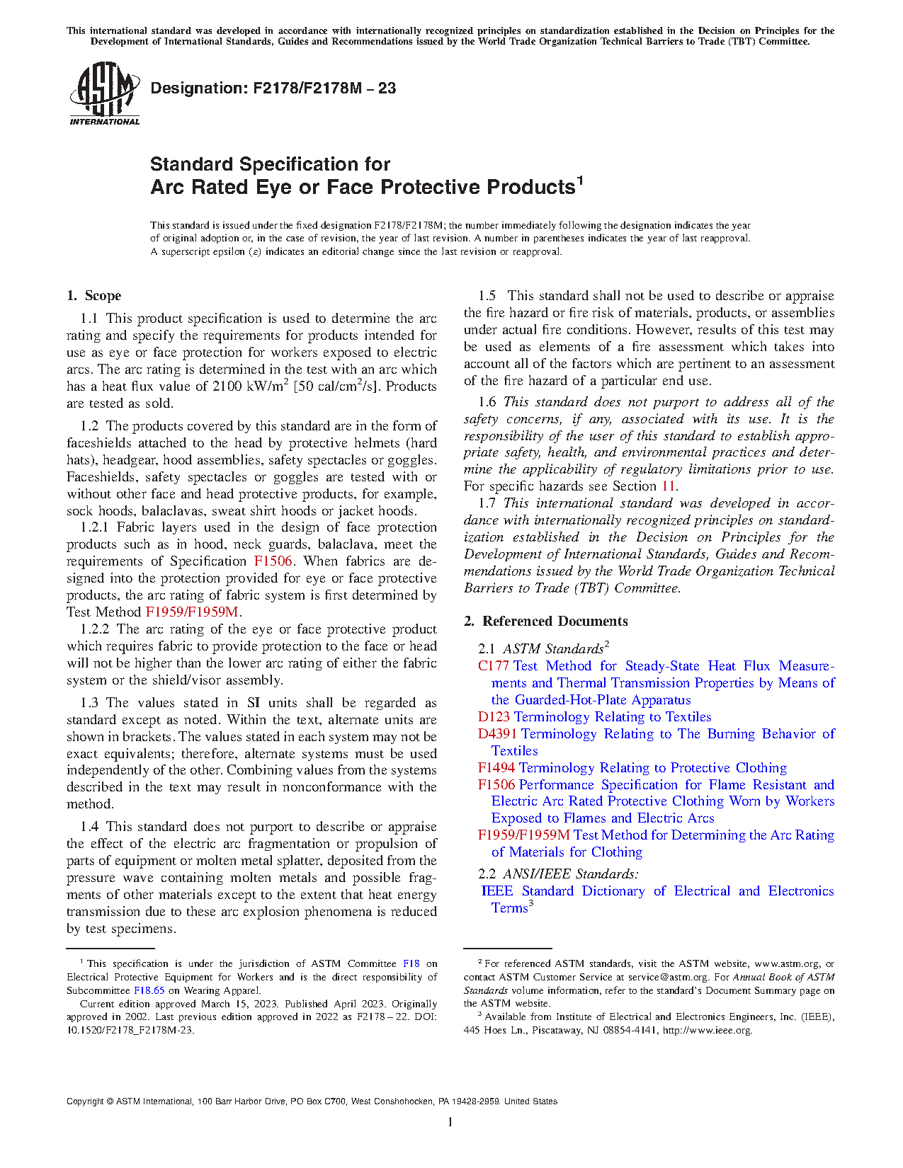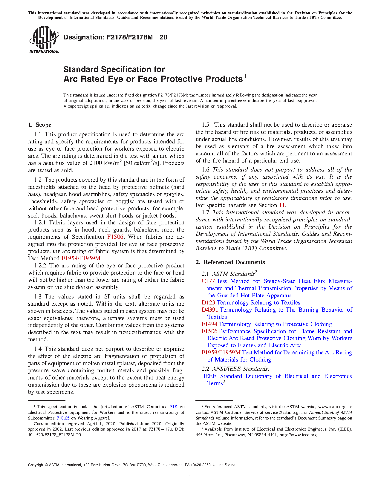 1.2.1 Fabric layers used in the design of face protection products such as in hood, neck guards, balaclava, meet the requirements of Specification F1506. When fabrics are designed into the protection provided for eye or face protective products, the arc rating of fabric system is first determined by Test Method F1959/F1959M.