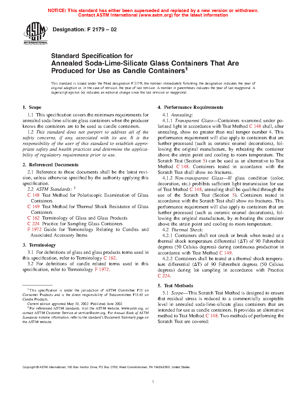 This specification covers the minimum performance requirements and associated test methods for annealed transparent or non-transparent soda-lime-silicate glass containers that are produced for use as candle containers. The glass containers shall conform to specified annealing and thermal shock requirements, and shall undergo appropriate scratch testing to ensure that residual stress is reduced to a commercially acceptable level.