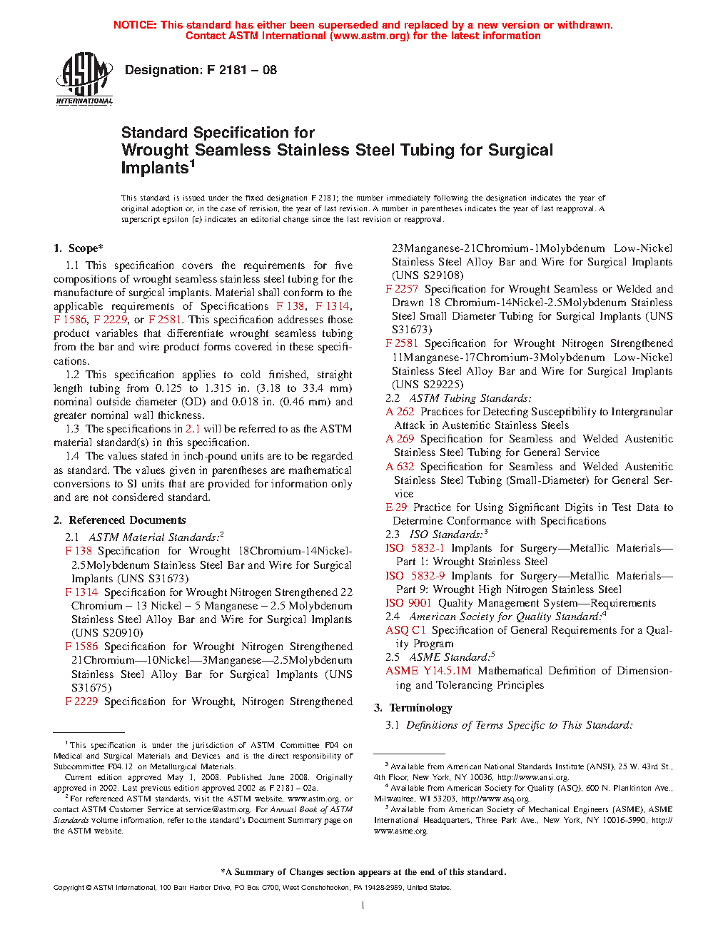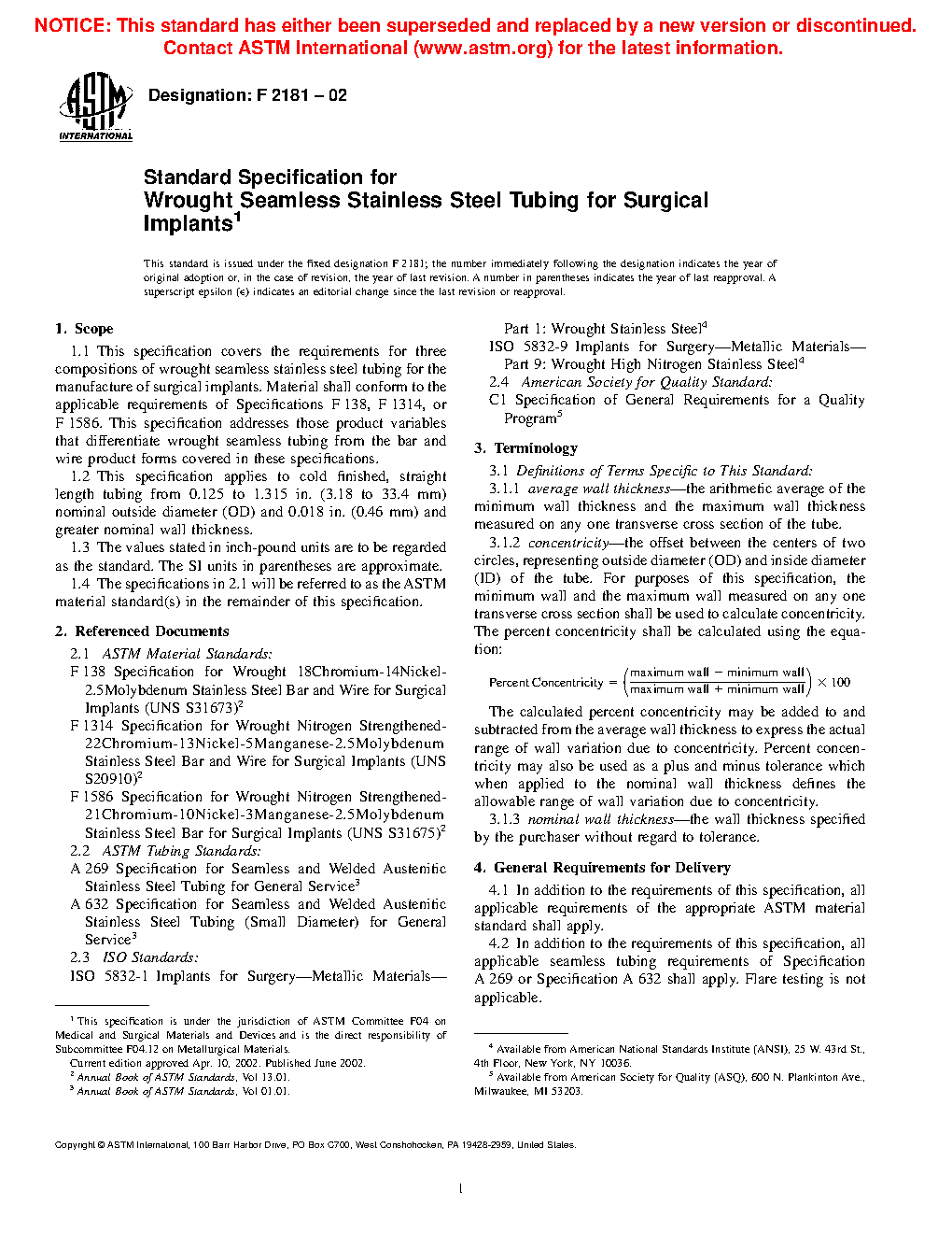 1.1 This specification covers the requirements for five compositions of wrought seamless stainless steel tubing for the manufacture of surgical implants. Material shall conform to the applicable requirements of Specification F138, F1314, F1586, F2229, or F2581. This specification addresses those product variables that differentiate wrought seamless tubing from the bar and wire product forms covered in these specifications.