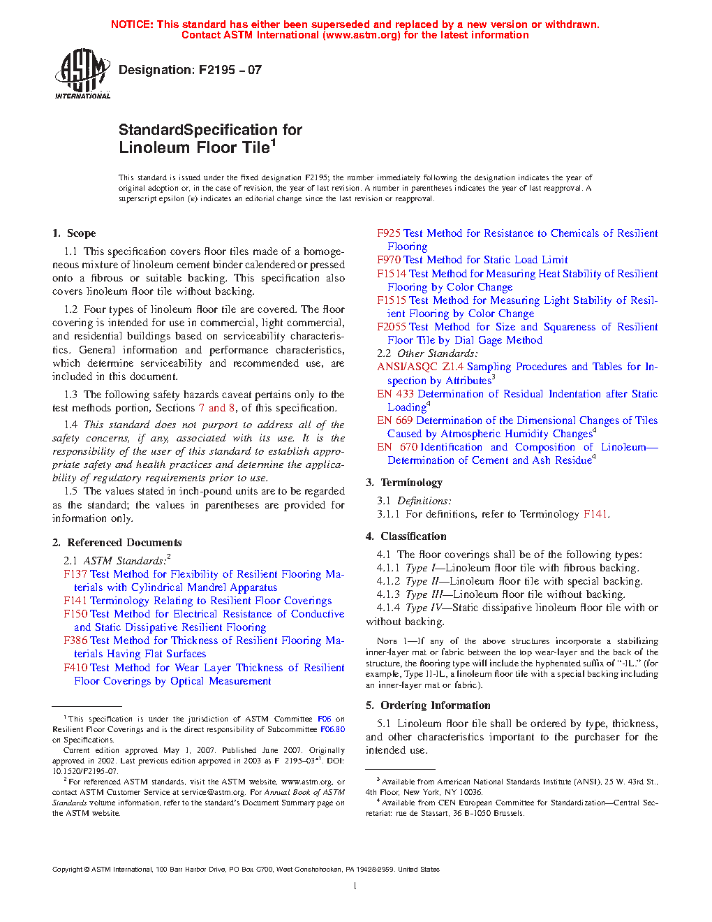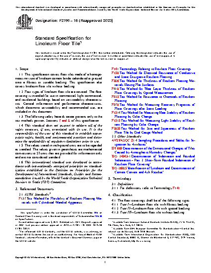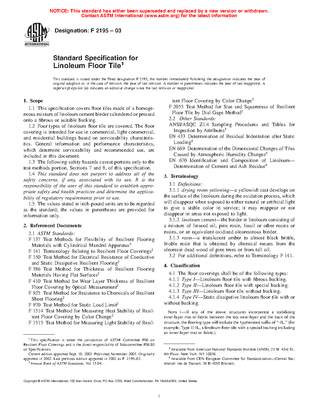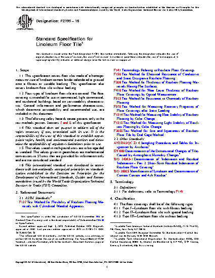 This specification covers floor tiles made of a homogeneous mixture of linoleum cement binder calendered or pressed onto a fibrous or suitable backing for use in commercial, light commercial and residential buildings based on serviceability characteristics. General information and performance characteristics, which determine serviceability and recommended use, are included in this document. The floor coverings shall be of the following types: Type I—linoleum floor tile with fibrous backing; Type II—linoleum floor tile with special backing; Type III—linoleum floor tile without backing; and Type IV—static dissipative linoleum floor tile with or without backing. Materials shall be tested and the individual grades shall conform to specified values of physical properties such as wear surface, size, thickness, and squareness; performance requirements such as residual indentation, static load resistance, flexibility, dimensional stability, resistance to chemicals, resistance to heat, resistance to light, and static dissipation.