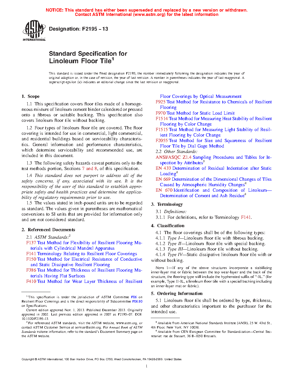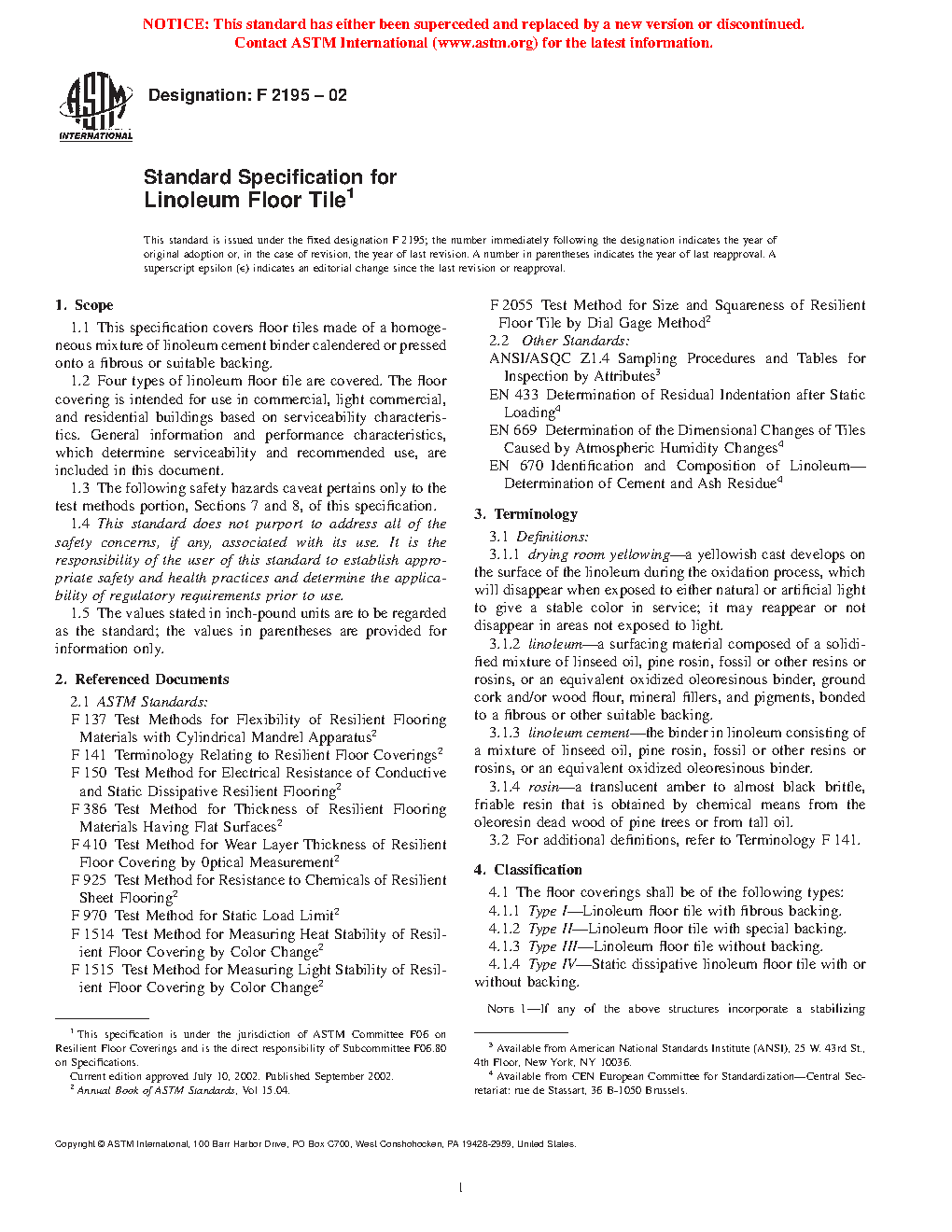 1.2 Four types of linoleum floor tile are covered. The floor covering is intended for use in commercial, light commercial, and residential buildings based on serviceability characteristics. General information and performance characteristics, which determine serviceability and recommended use, are included in this document.