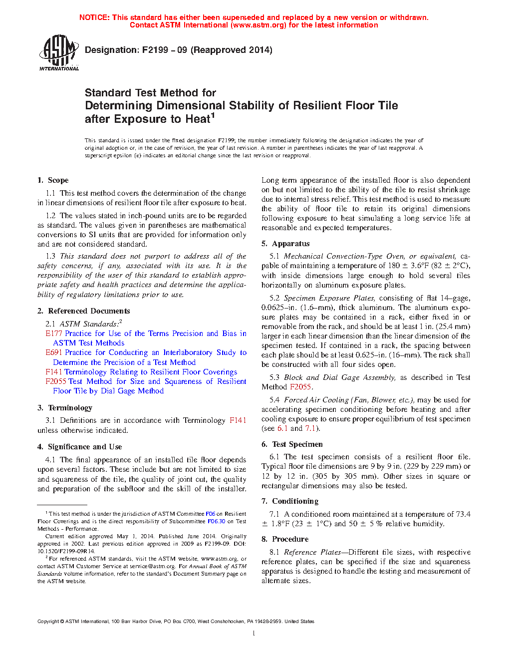 4.1 The final appearance of an installed floor depends upon several factors. These include but are not limited to size and squareness in the case of tiles/planks, the quality of joint cut, the quality and preparation of the subfloor and the skill of the installer. Long term appearance of the installed floor is also dependent on but not limited to the ability of the tile/plank to resist shrinkage due to internal stress relief. This test method is used to measure the ability of the floor to retain its original dimensions following exposure to heat, simulating a long service life at reasonable and expected temperatures.