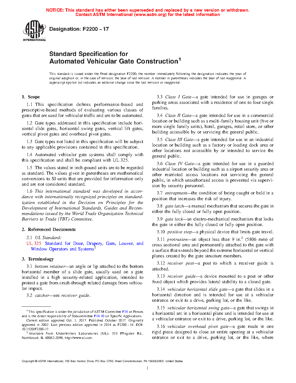 This specification establishes the performance-based and prescriptive-based methods of evaluating various classes of automated gate constructions that are used for vehicular traffic. The gate types addressed in this specification include horizontal slide gates, horizontal swing gates, vertical lift gates, vertical pivot gates, and overhead pivot gates. Conversely, the four classes of gates covered here are as follows: Class I, a gate for the garage or parking area intended for use in a home of a one-to-four single family dwelling; Class II, a gate intended for use in a commercial location or building such as a multi-family housing unit (five or more single family units), hotel, garages, retail store, or other building servicing the general public; Class III, a gate intended for use in an industrial location or building such as a factory, loading dock area, or other locations not intended to service the general public; and Class IV, a gate intended for use in a guarded industrial location or building such as an airport security area, or other restricted access locations not servicing the general public, in which unauthorized access is prevented by means of supervision by security personnel.