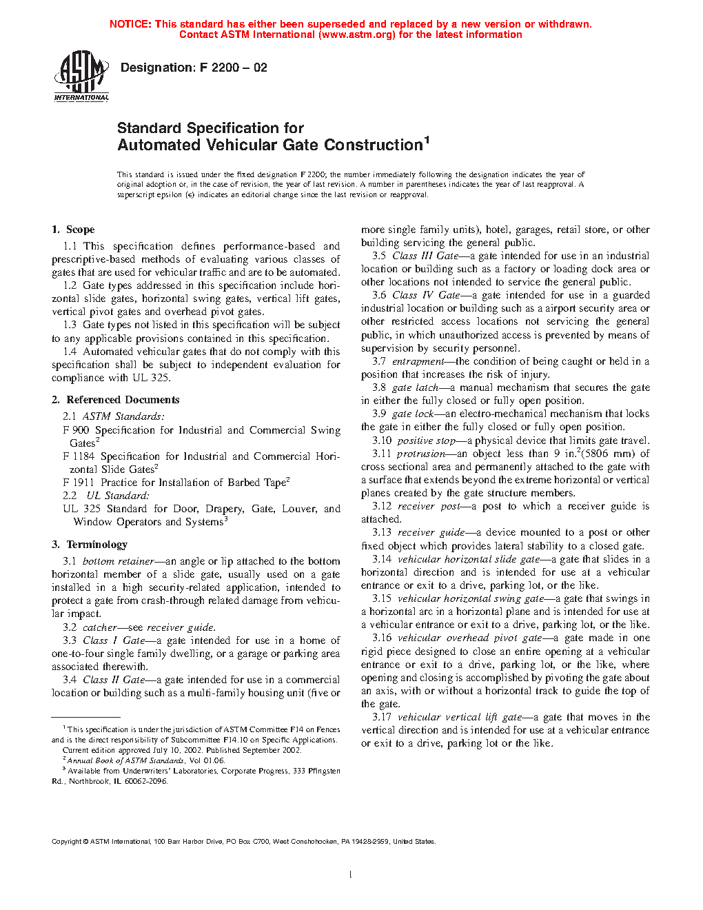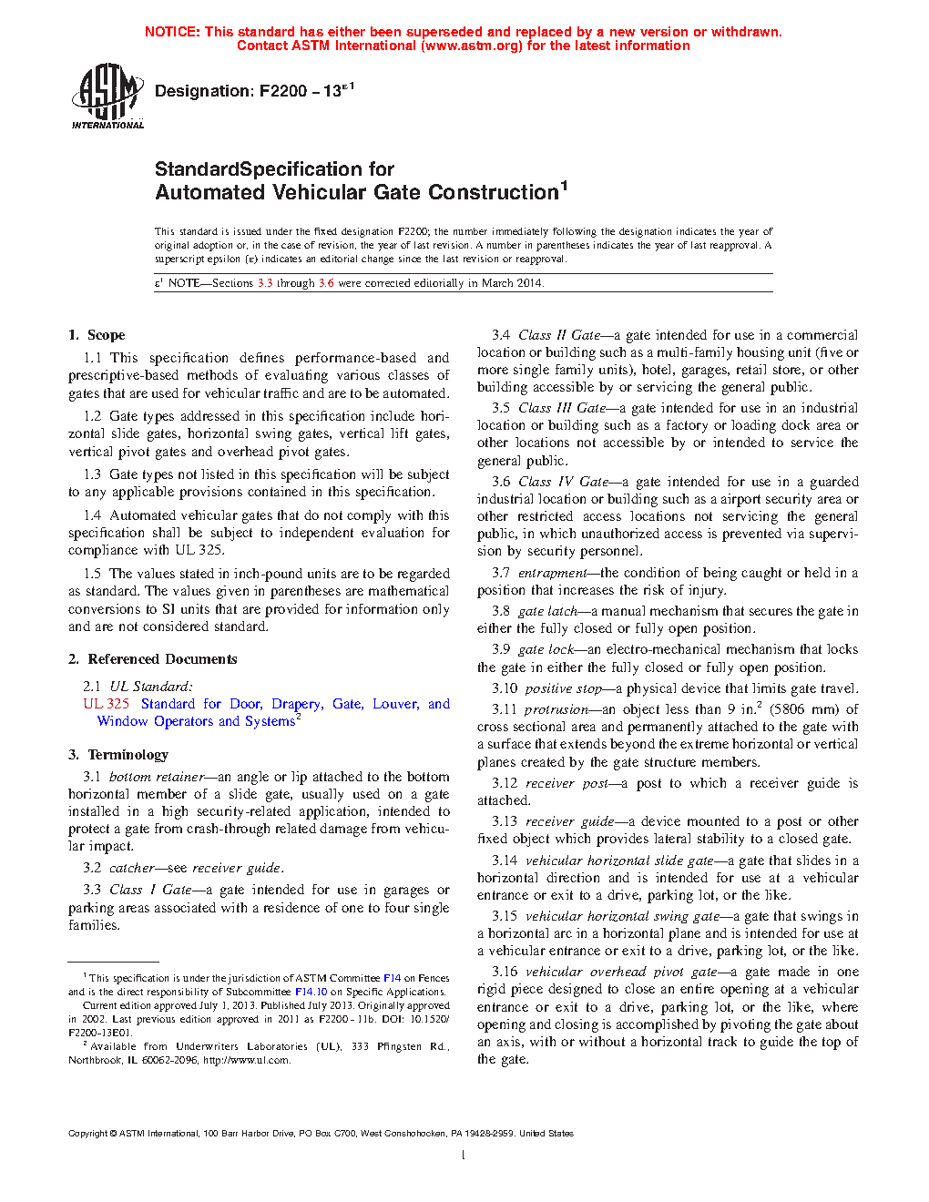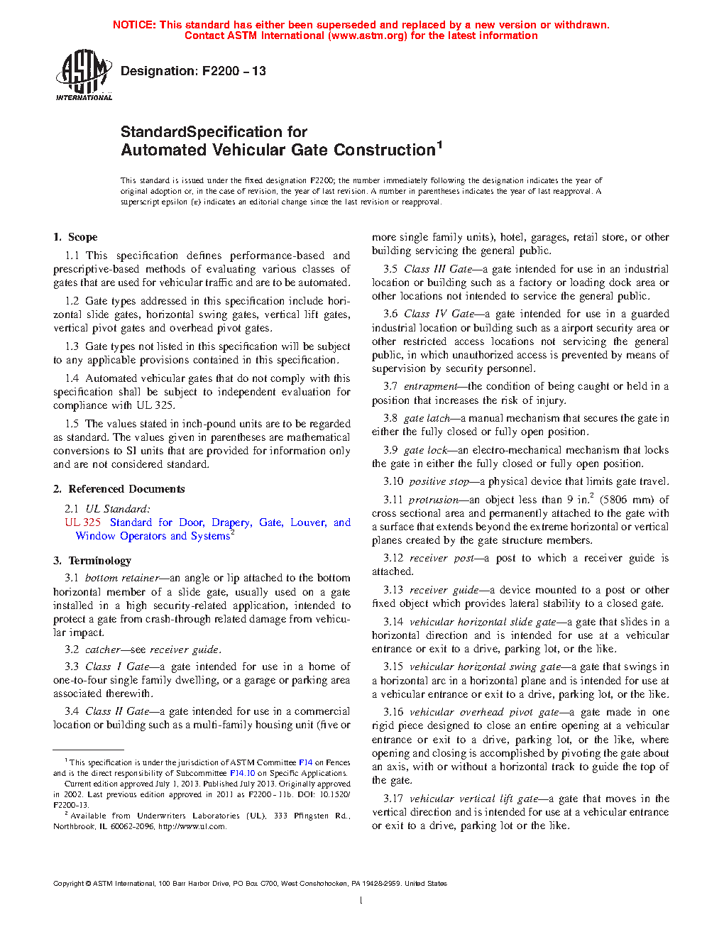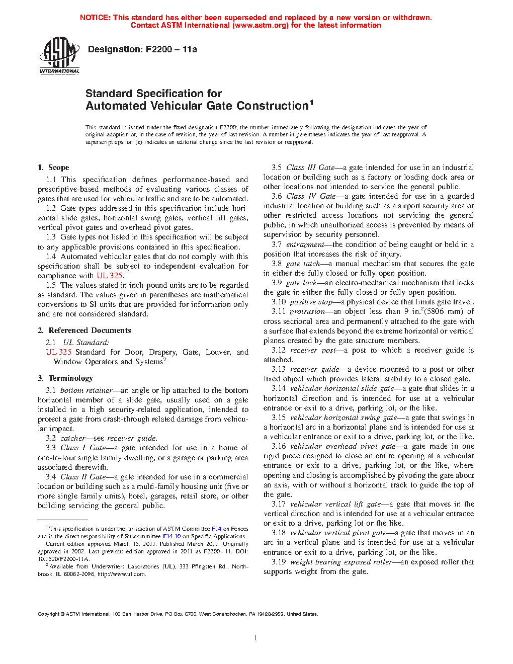 1.4 Automated vehicular gate systems shall comply with this specification and shall be compliant with UL 325.