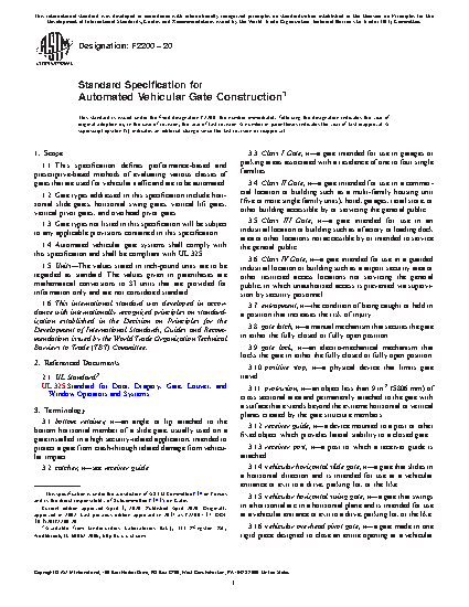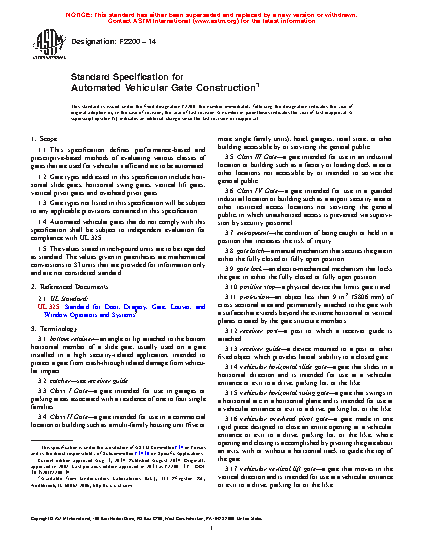 1.1 This specification defines performance-based and prescriptive-based methods of evaluating various classes of gates that are used for vehicular traffic and are to be automated.