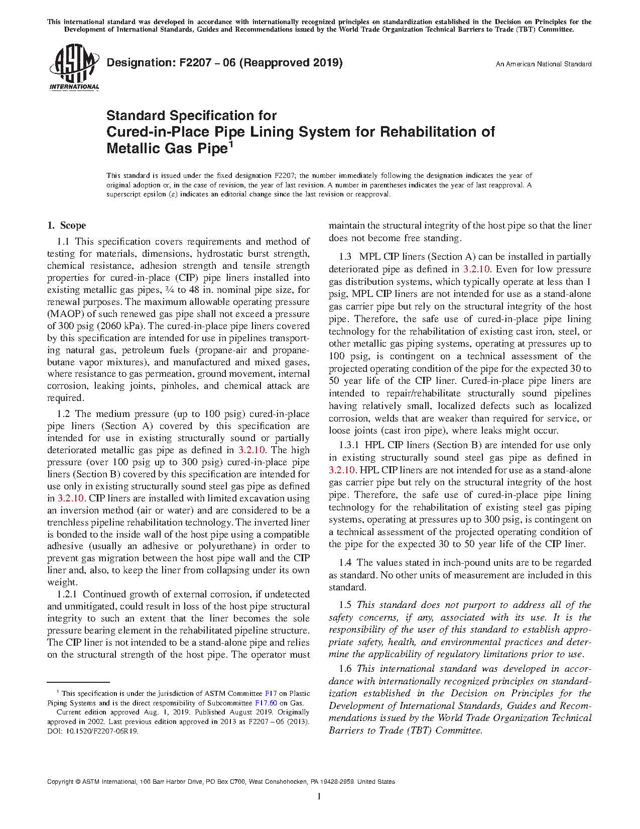 1.3.1 HPL CIP liners (Section B) are intended for use only in existing structurally sound steel gas pipe as defined in 3.2.10. HPL CIP liners are not intended for use as a stand-alone gas carrier pipe but rely on the structural integrity of the host pipe. Therefore, the safe use of cured-in-place pipe lining technology for the rehabilitation of existing steel gas piping systems, operating at pressures up to 300 psig, is contingent on a technical assessment of the projected operating condition of the pipe for the expected 30 to 50 year life of the CIP liner.