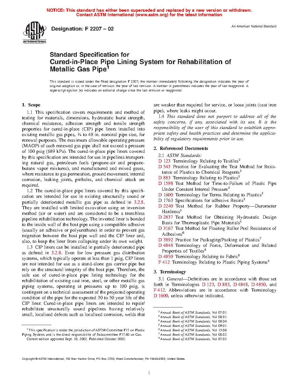 This specification covers the requirements and test procedures for materials, dimensions, hydrostatic burst strength, chemical resistance, peeling strength, adhesion strength, and tensile strength properties for cured-in-place (CIP) pipe liners installed into existing metallic gas pipes for rehabilitation purposes. These cured-in-place pipe liners are intended for use in pipelines that transport natural gas, petroleum fuels (propane-air and propanebutane vapor mixtures), and manufactured and mixed gases, where resistance to gas permeation, ground movement, internal corrosion, leaking joints, pinholes, and chemical attack are required. The materials, which shall be considered separately for testing, consist of the flexible tubing, jacket, elastomer skin, and adhesive system.