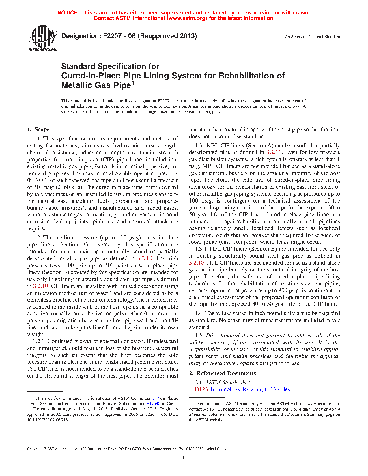 1.3.1 HPL CIP liners (Section B) are intended for use only in existing structurally sound steel gas pipe as defined in 3.2.10. HPL CIP liners are not intended for use as a stand-alone gas carrier pipe but rely on the structural integrity of the host pipe. Therefore, the safe use of cured-in-place pipe lining technology for the rehabilitation of existing steel gas piping systems, operating at pressures up to 300 psig, is contingent on a technical assessment of the projected operating condition of the pipe for the expected 30 to 50 year life of the CIP liner.
