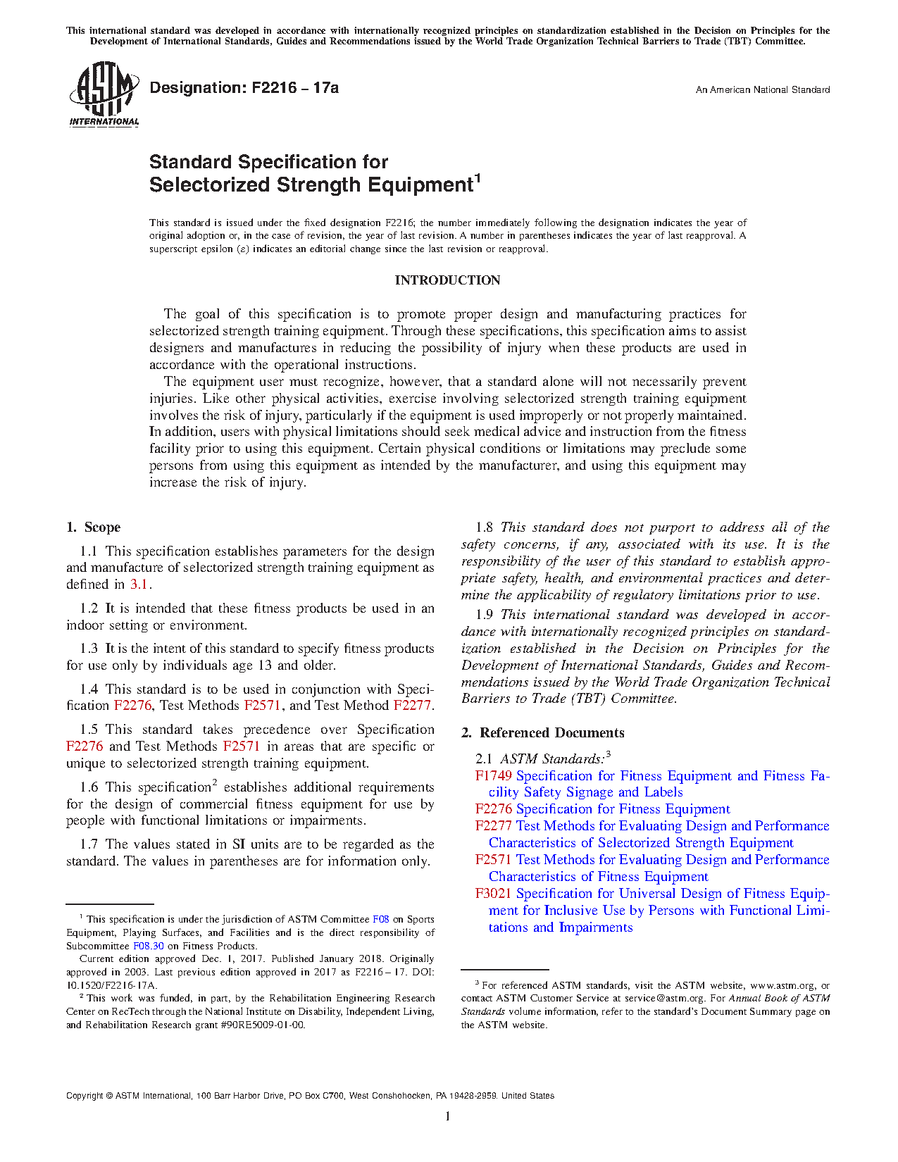 1.5 This standard takes precedence over Specification F2276 and Test Methods F2571 in areas that are specific or unique to selectorized strength training equipment.
