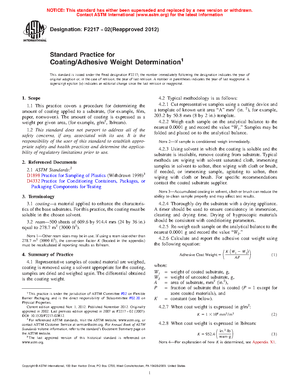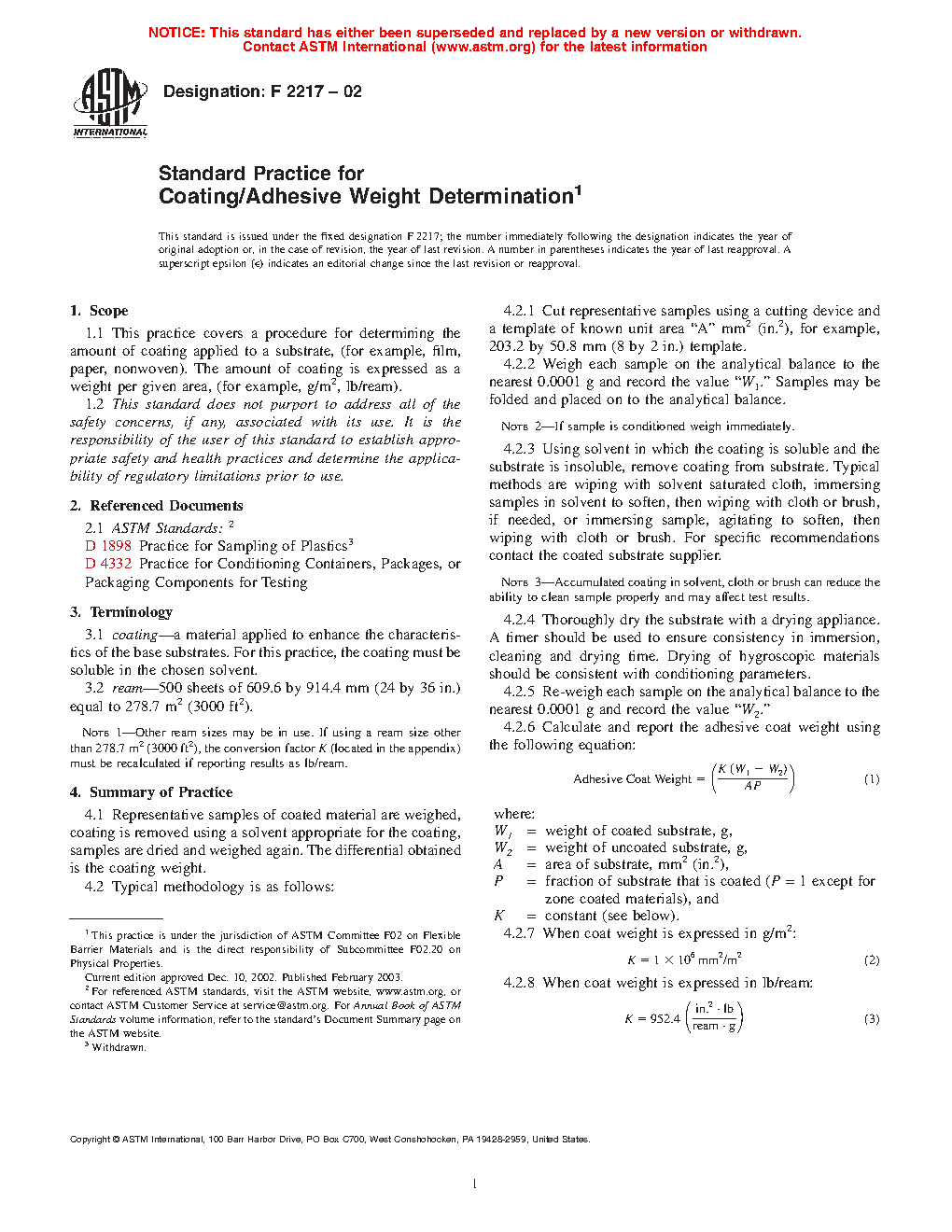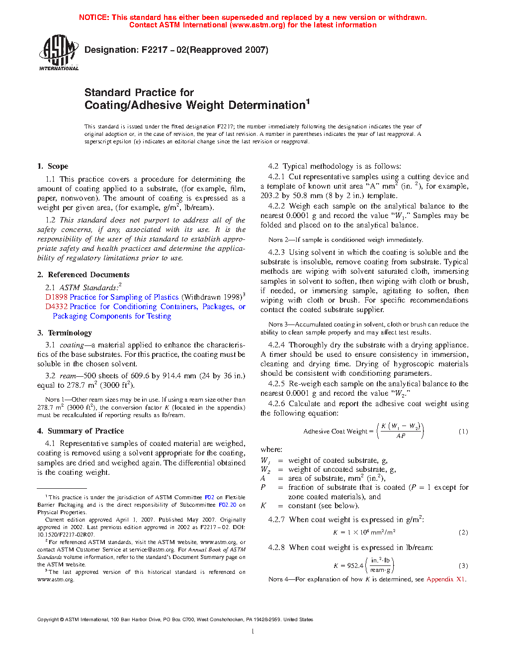 1.1 This practice covers a procedure for determining the amount of coating applied to a substrate, (for example, film, paper, nonwoven). The amount of coating is expressed as a weight per given area, (for example, g/m2, lb/ream).