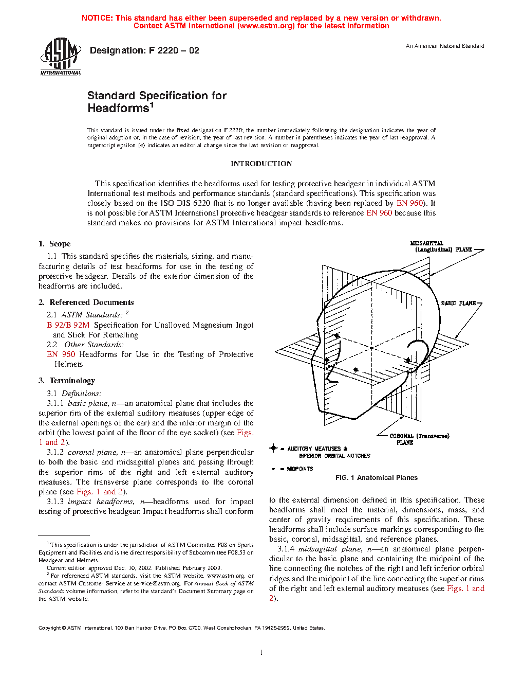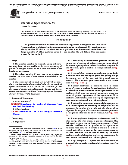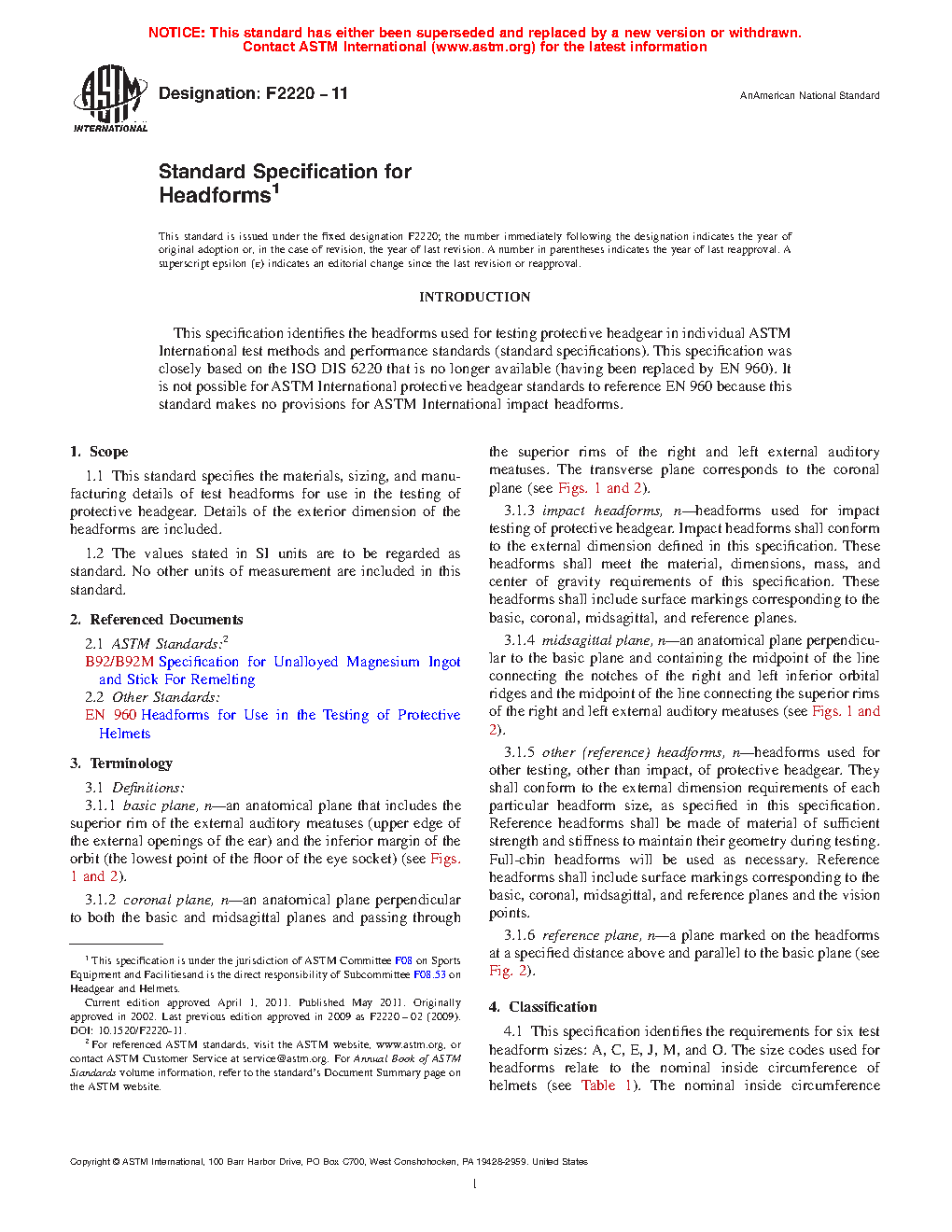 This specification covers the materials, sizing, and manufacturing details of test headforms for use in the testing of protective headgear. This specification identifies the requirements for five test headform size codes: A, E, J, M, and O. All datum levels shall be quoted relative to the reference plane. The headforms shall be symmetrical about the midsagittal plane. Internal geometry may be defined to satisfy the requirements of the individual test specifications. The impact headforms shall be made of K1A-F magnesium, with the prescribed zirconium and magnesium composition, and shall conform to the specified requirements for: external dimensions, performance (resonant frequency), mass, and center of gravity. All impact headforms shall be marked with: headform size, basic plane, reference plane, and midsagittal (longitudinal) and coronal (transverse) planes through the vertical axis. Other headforms shall be made of material of sufficient strength and stiffness to maintain their geometry during testing and shall comply to the external dimension requirements.