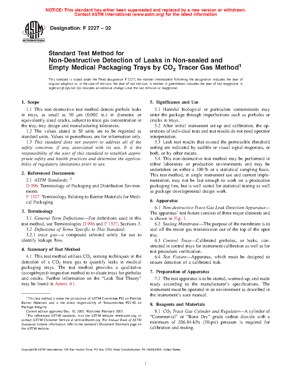 1.1 This non-destructive test method detects pinhole leaks in trays, as small as 50 m (0.002 in.) in diameter, or equivalently sized cracks, subject to trace gas concentration in the tray, tray design and manufacturing tolerances.