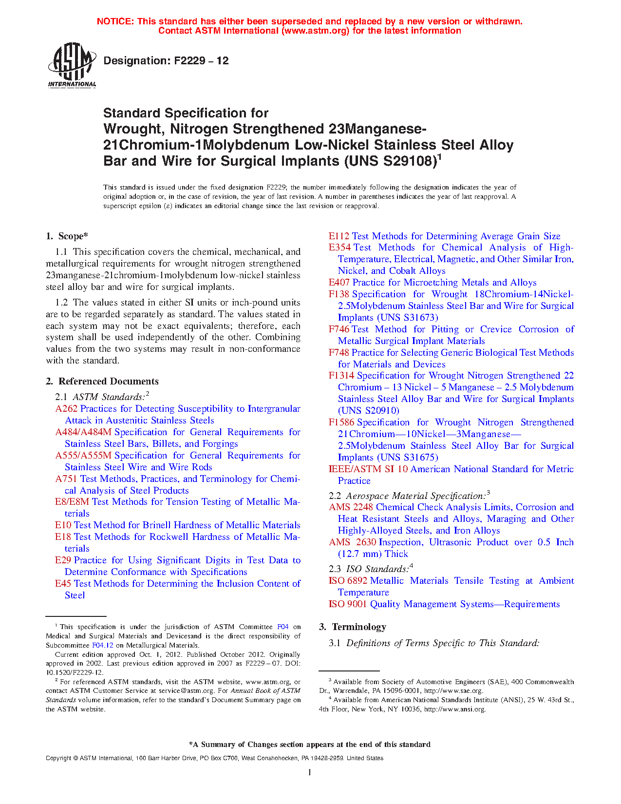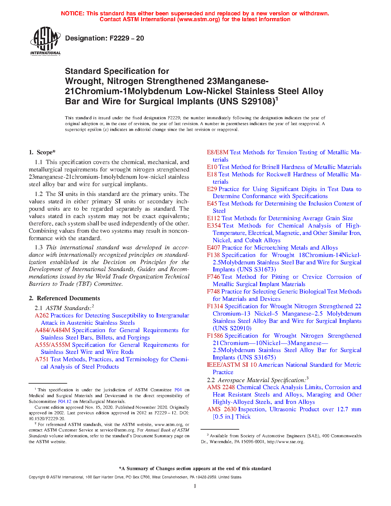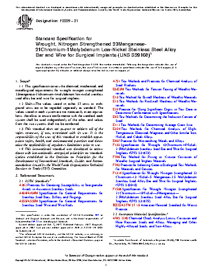 1.1 This specification covers the chemical, mechanical, and metallurgical requirements for wrought nitrogen strengthened 23manganese-21chromium-1molybdenum low-nickel stainless steel alloy bar and wire for surgical implants.