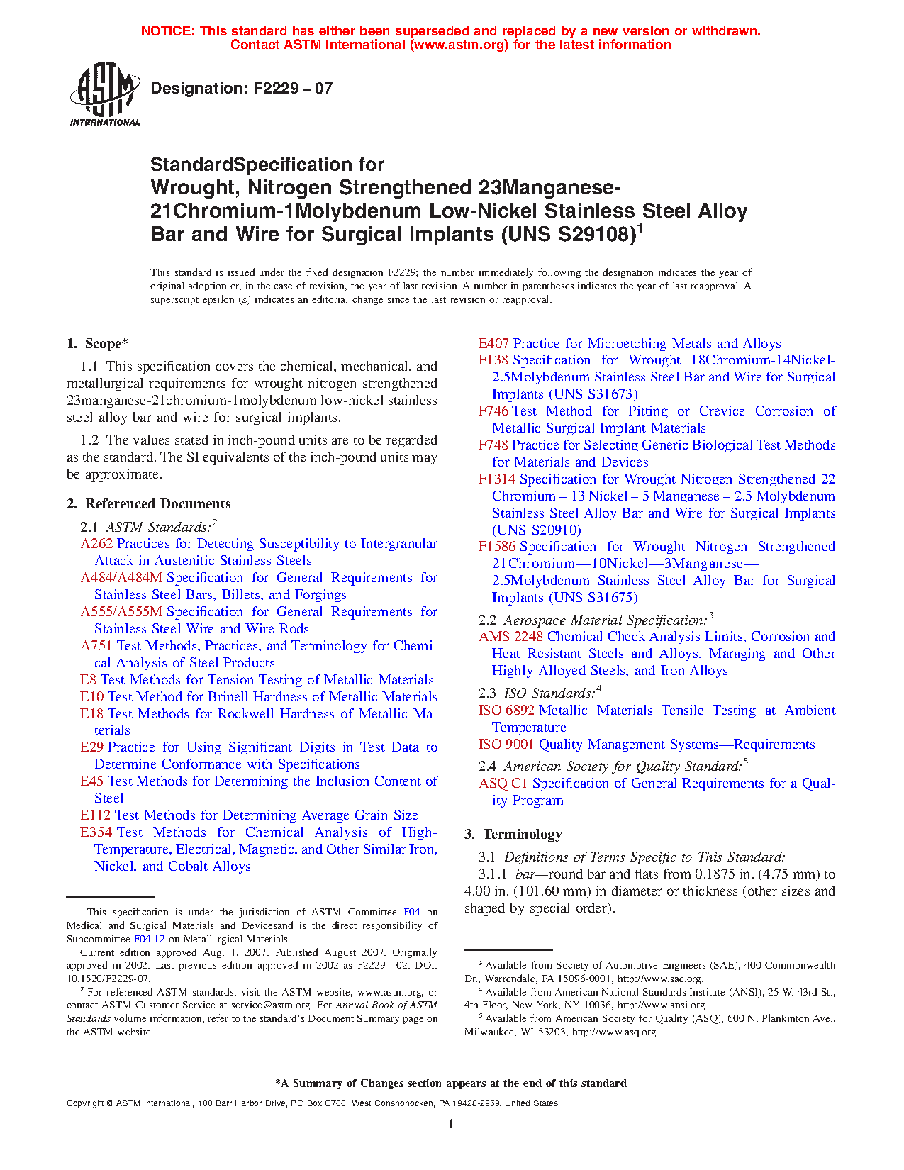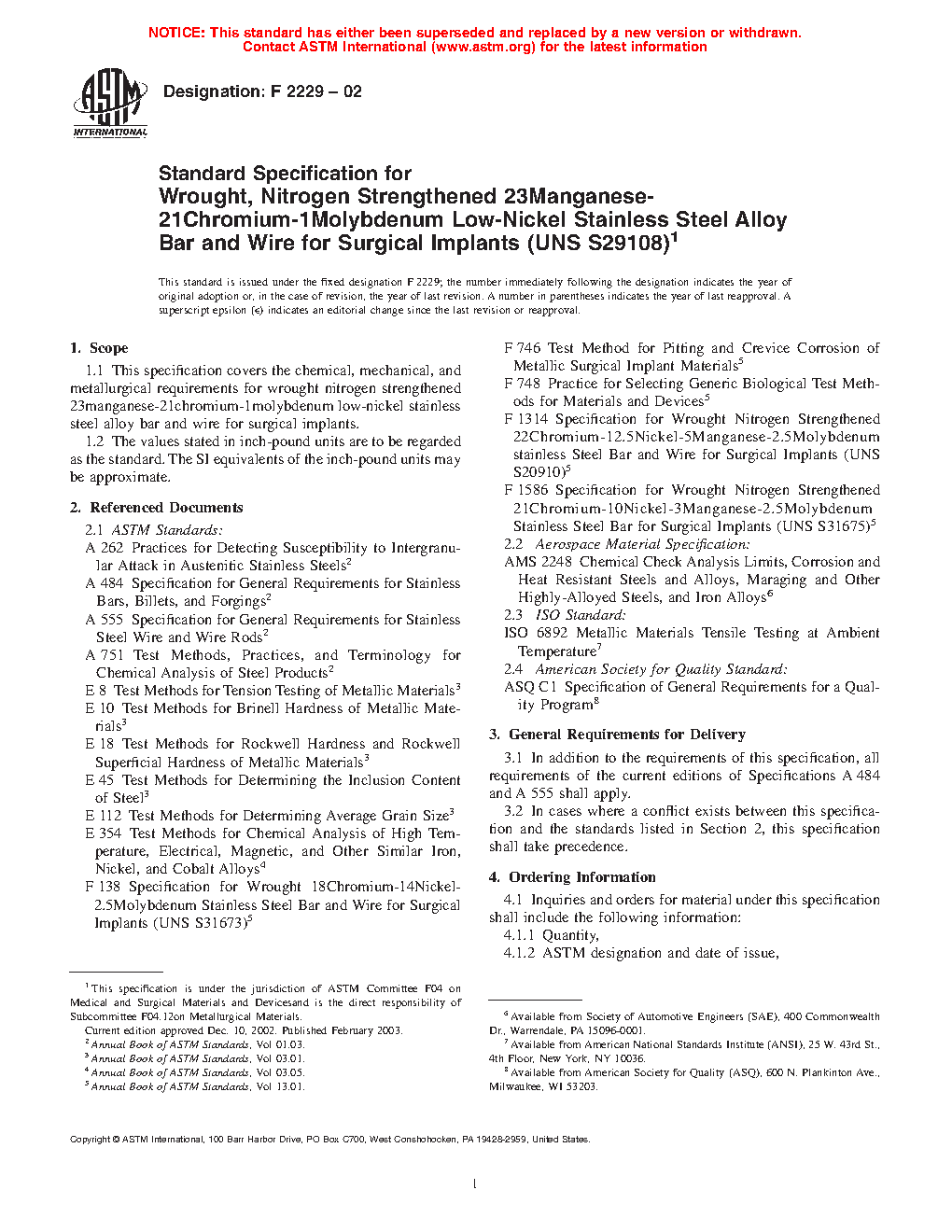 This specification covers the chemical, mechanical, and metallurgical requirements for wrought, nitrogen strengthened manganese-chromium-molybdenum low-nickel stainless steel alloy bars and wires used for surgical implants. All bars and wires should be furnished as specified in either annealed or cold-worked condition and in cold-drawn, pickled, ground and polished, ground, or any other specified finish. The products should conform to the required chemical composition, microcleanliness, purity, surface finish, tensile properties, and hardness and should pass the intergranular corrosion susceptibility test. Both wires and bars must have a homogenous microstructure and with grain sizes within the specified range.