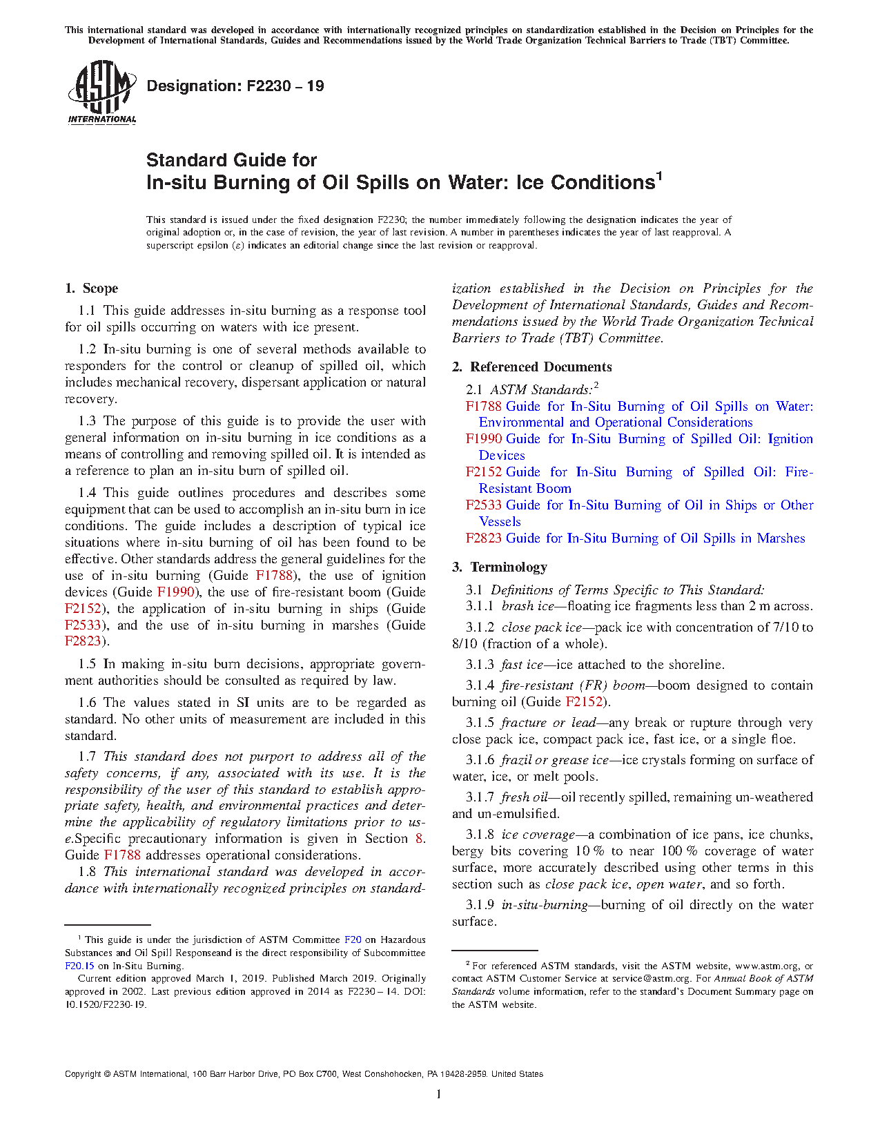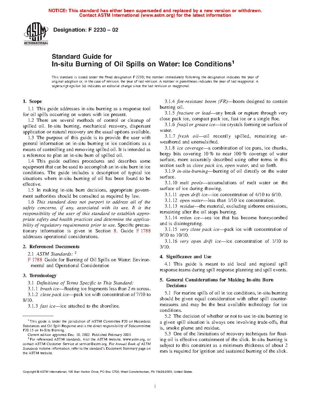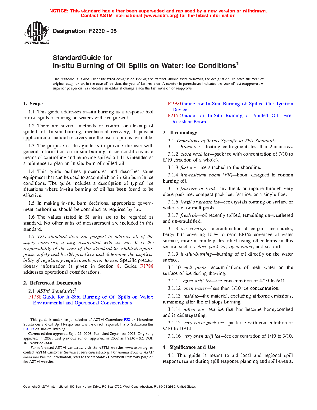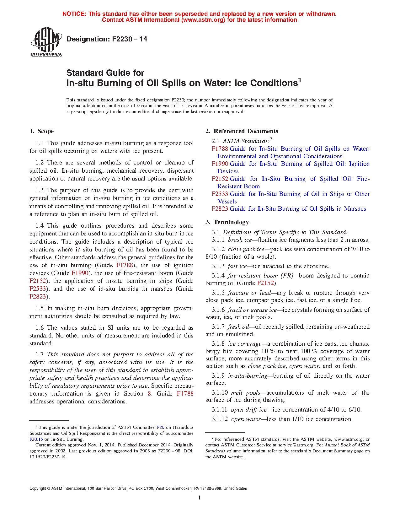 1.4 This guide outlines procedures and describes some equipment that can be used to accomplish an in-situ burn in ice conditions. The guide includes a description of typical ice situations where in-situ burning of oil has been found to be effective. Other standards address the general guidelines for the use of in-situ burning (Guide F1788), the use of ignition devices (Guide F1990), the use of fire-resistant boom (Guide F2152), the application of in-situ burning in ships (Guide F2533), and the use of in-situ burning in marshes (Guide F2823).