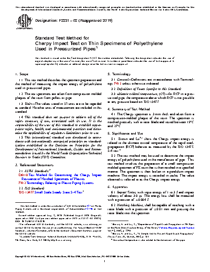 1.1 This test method describes the specimen preparation and the method of measuring the impact energy of polyethylene used in pressurized pipes.