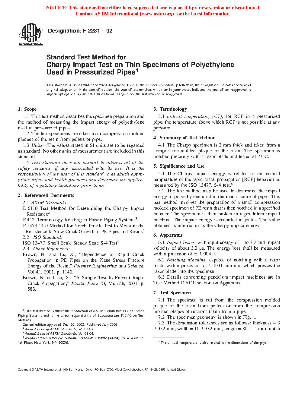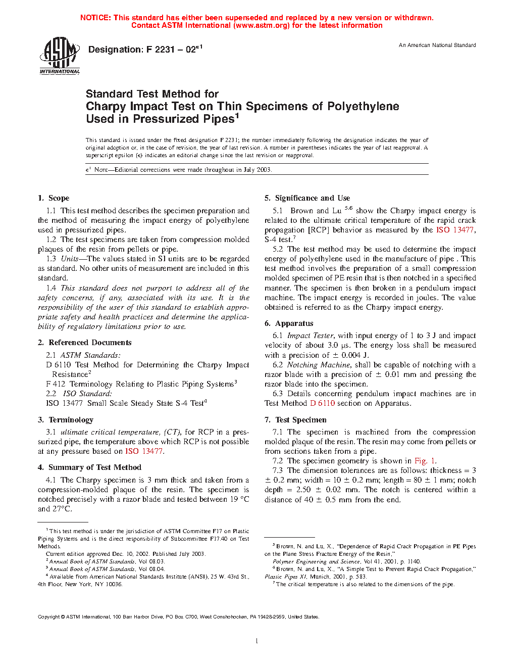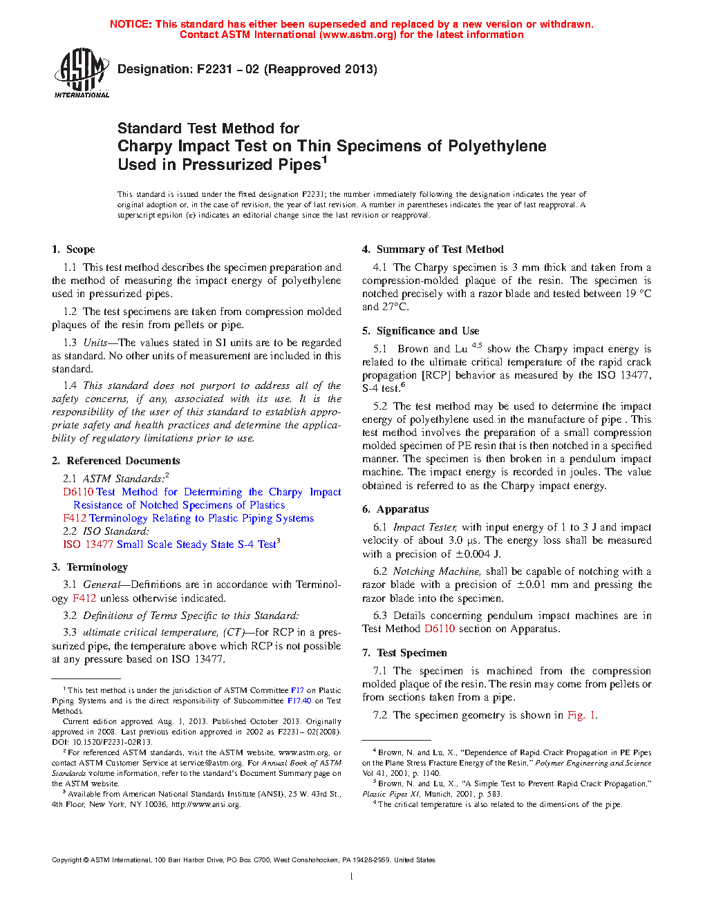 5.1 Brown and Lu4,5 show the Charpy impact energy is related to the ultimate critical temperature of the rapid crack propagation [RCP] behavior as measured by the ISO 13477, S-4 test.6