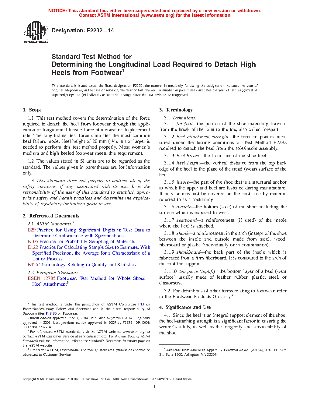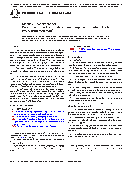 1.1 This test method covers the determination of the force required to detach the heel from footwear through the application of longitudinal tensile force at a constant displacement rate. The longitudinal test force simulates the most common heel failure mode. Heel height of 20 mm (13/16 in.) or larger is needed to perform this test method properly. Most women's medium and high heeled footwear meets this requirement.