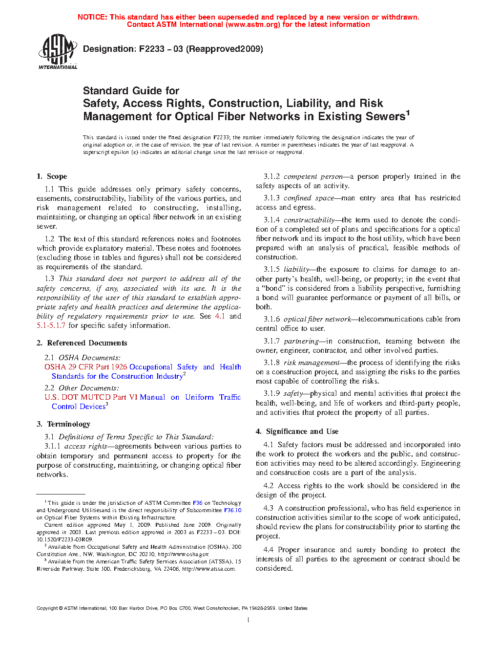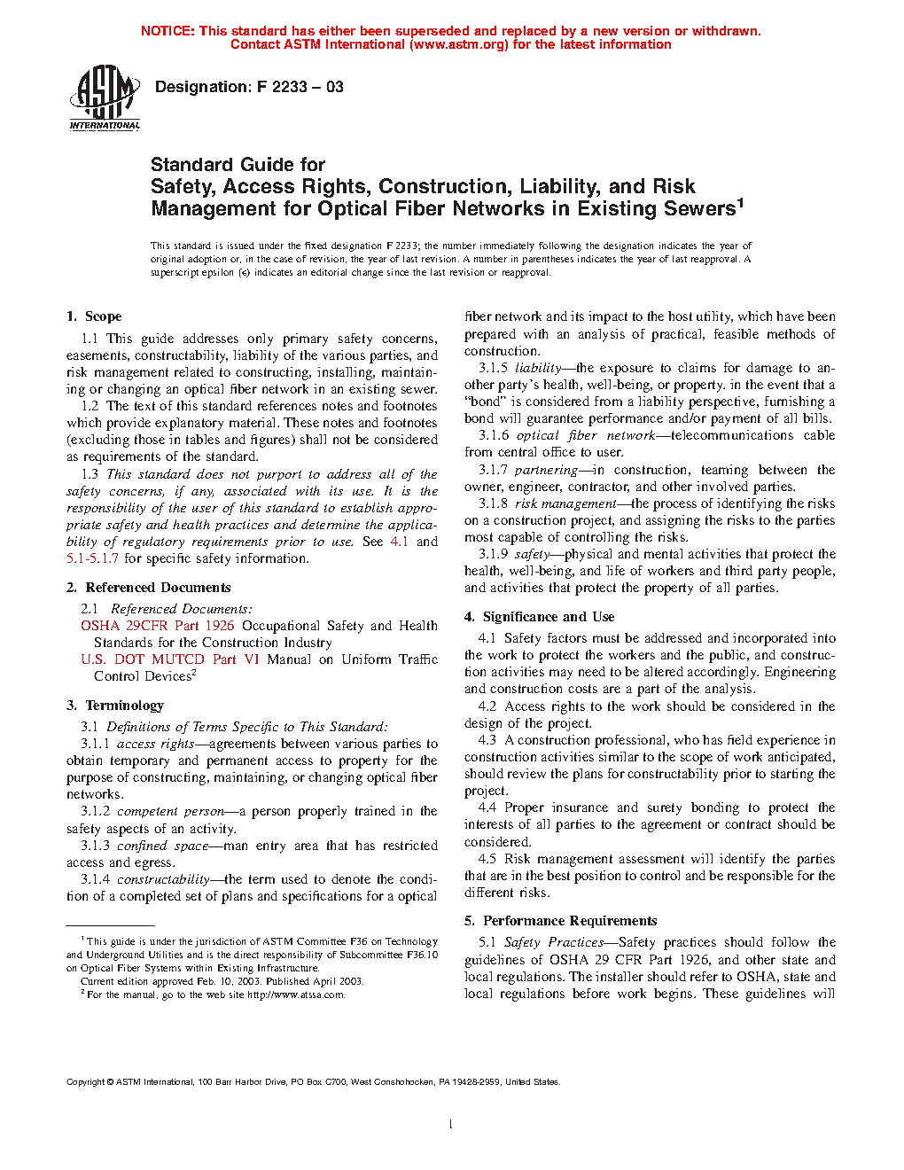 1.1 This guide addresses only primary safety concerns, easements, constructability, liability of the various parties, and risk management related to constructing, installing, maintaining or changing an optical fiber network in an existing sewer.