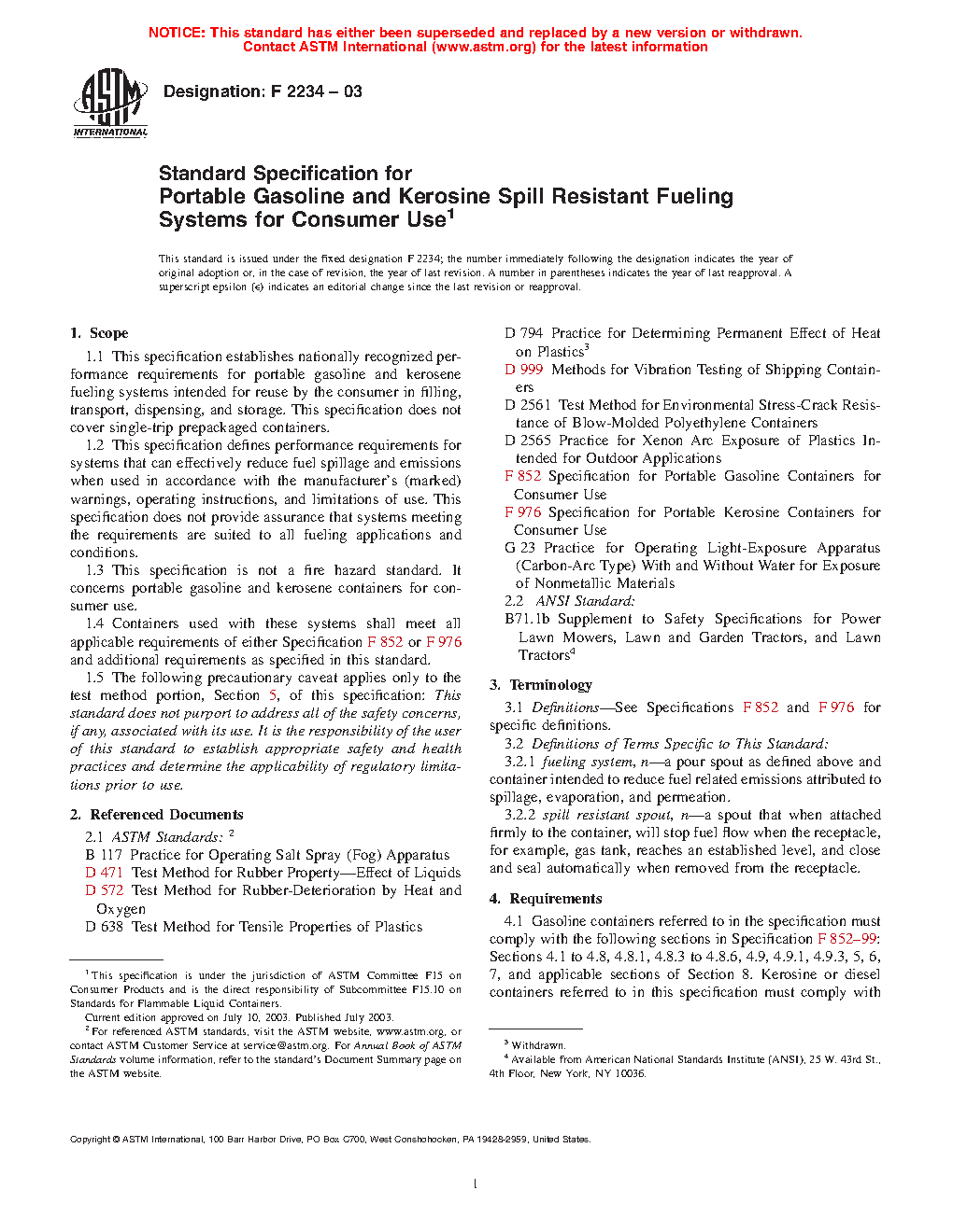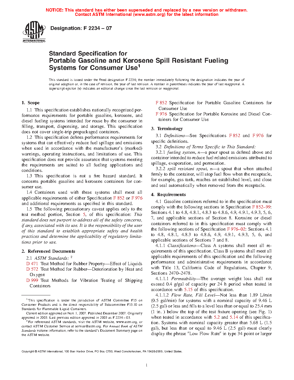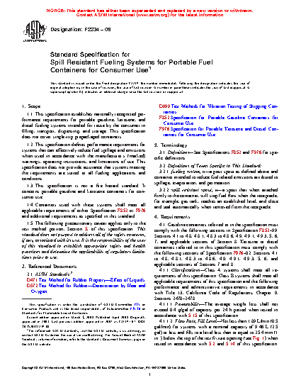 1.1 This specification establishes nationally recognized performance requirements for portable gasoline, kerosene, and diesel fueling systems intended for reuse by the consumer in filling, transport, dispensing, and storage. This specification does not cover single-trip prepackaged containers.