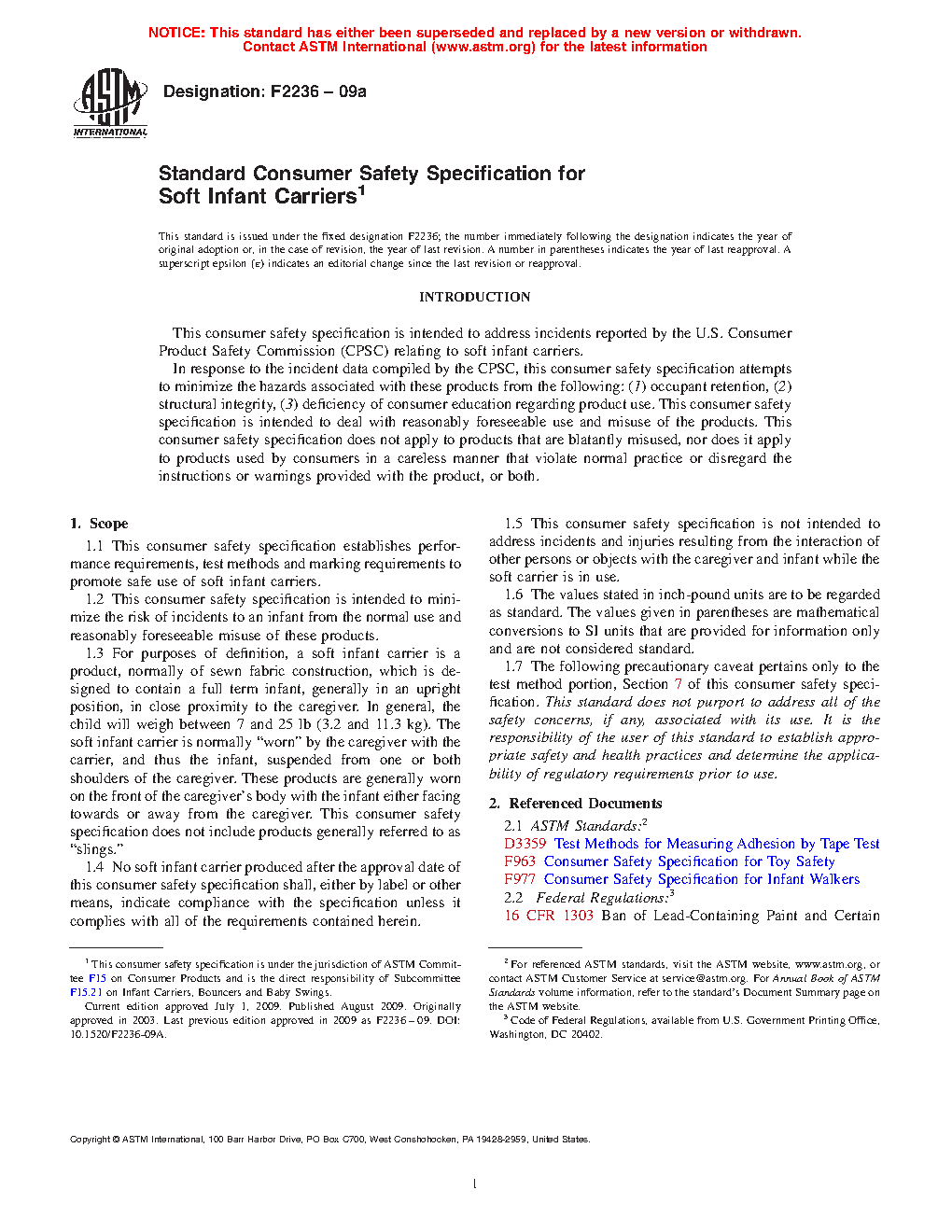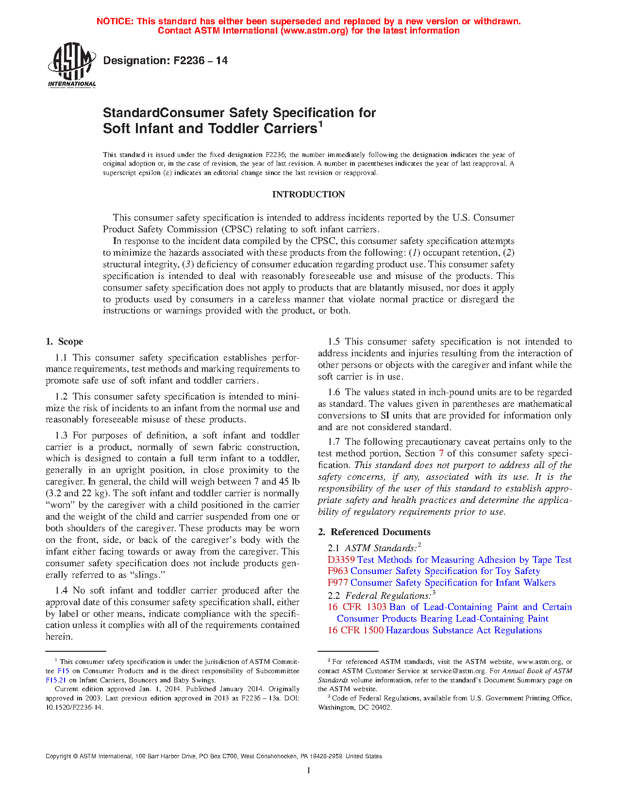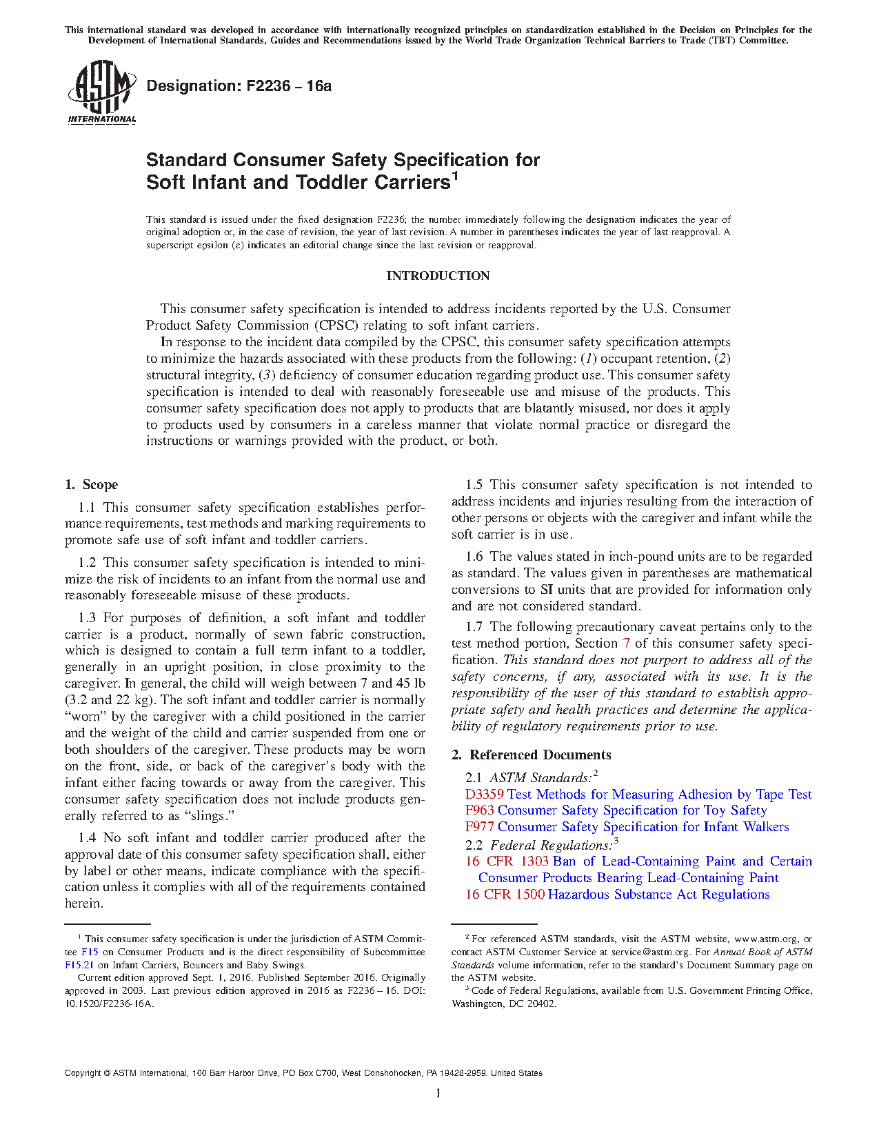 1.1 This consumer safety specification establishes performance requirements, test methods and marking requirements to promote safe use of soft infant and toddler carriers.