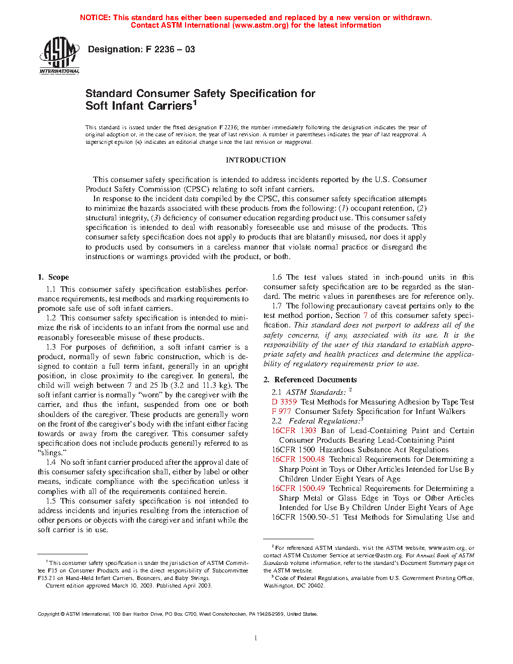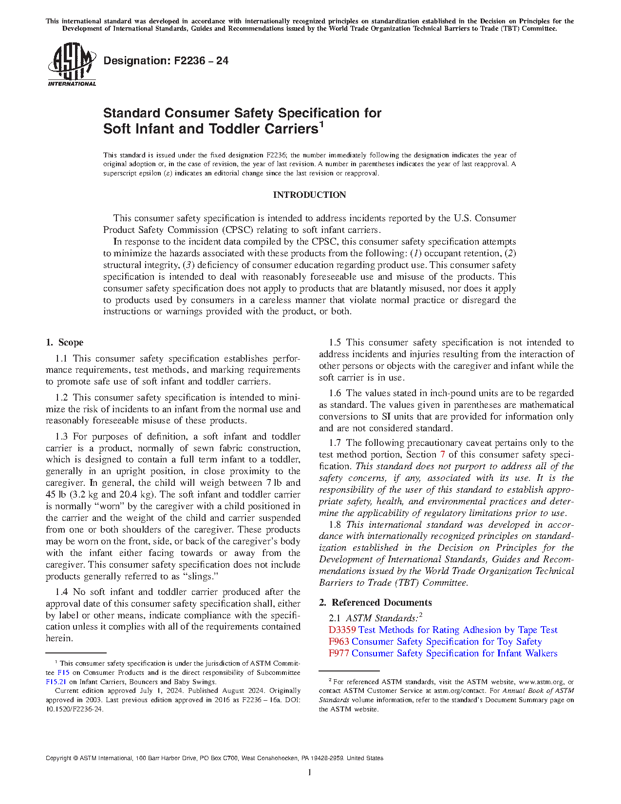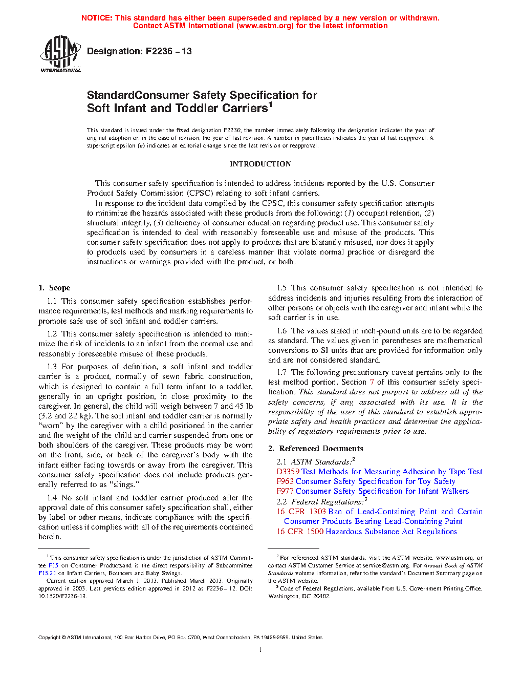 1.1 This consumer safety specification establishes performance requirements, test methods and marking requirements to promote safe use of soft infant and toddler carriers.