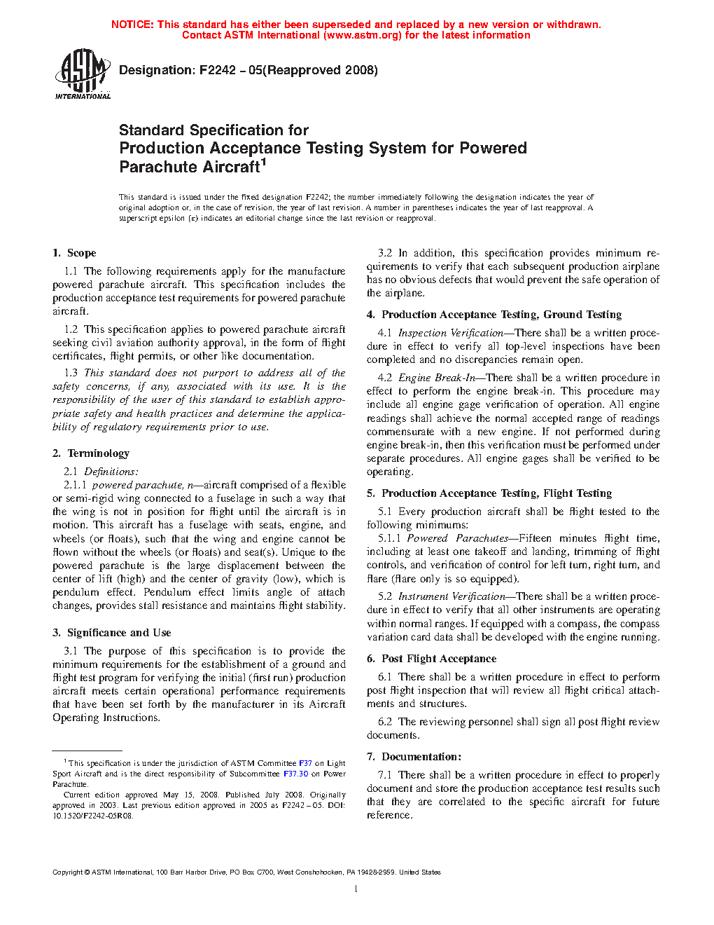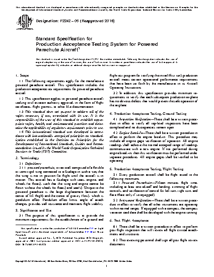 1.1 The following requirements apply for the manufacture powered parachute aircraft. This standard includes the production acceptance test requirements for powered parachute aircraft.
