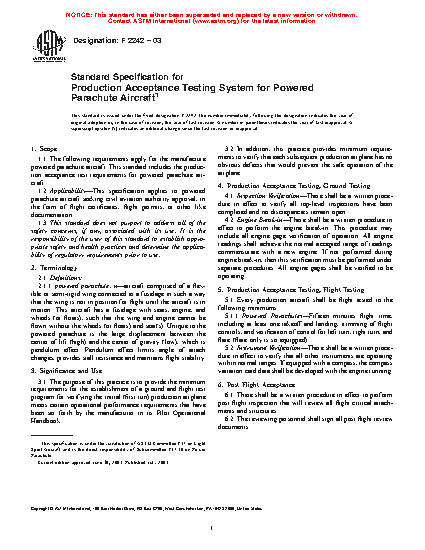 1.1 The following requirements apply for the manufacture powered parachute aircraft. This specification includes the production acceptance test requirements for powered parachute aircraft.