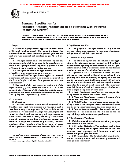 This specification covers the requirements that apply for the manufacture of powered parachute aircraft; it includes pilot operating handbook requirements for powered parachute aircraft. This applies to powered parachute aircraft seeking civil aviation authority approval, in the form of flight certificates, flight permits, or other similar documentation. Each light sport aircraft must include an aircraft operating instructions which includes: operating limitations, operating data, format; supplements, and data location and contact information. Each aircraft shall have a maintenance manual provided for the aircraft that covers the minimum of the requirements as defined by the aircraft manufacturer.