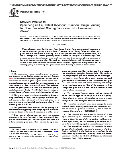 1.1 This practice sets forth a method to specify an equivalent 3-second design loading suitable to use with Practice E1300 to select the thickness and type of blast resistant glazing fabricated with laminated glass to glaze a fenestration. Glass plies used to construct laminated glass are recommended to be either annealed or heat strengthened glass.