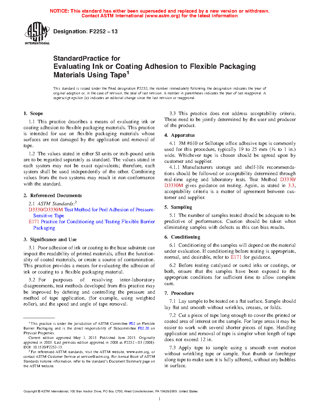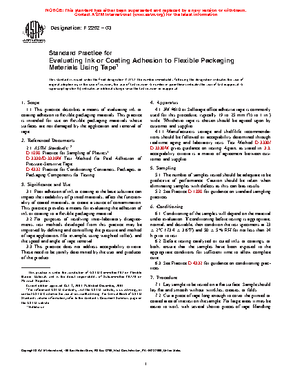 1.1 This practice describes a means of evaluating ink or coating adhesion to flexible packaging materials. This practice is intended for use on flexible packaging materials whose surfaces are not damaged by the application and removal of tape.