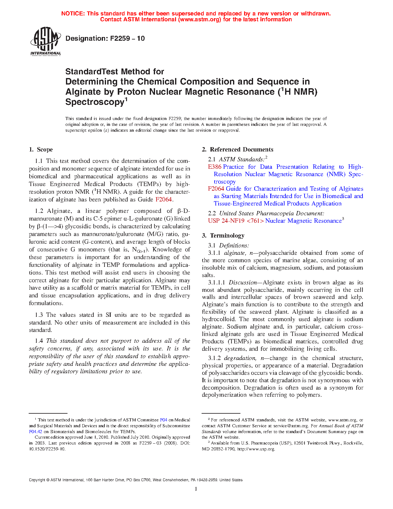 1.1 This test method covers the determination of the composition and monomer sequence of alginate intended for use in biomedical and pharmaceutical applications as well as in Tissue Engineered Medical Products (TEMPs) by high-resolution proton NMR (1H NMR). A guide for the characterization of alginate has been published as Guide F2064.