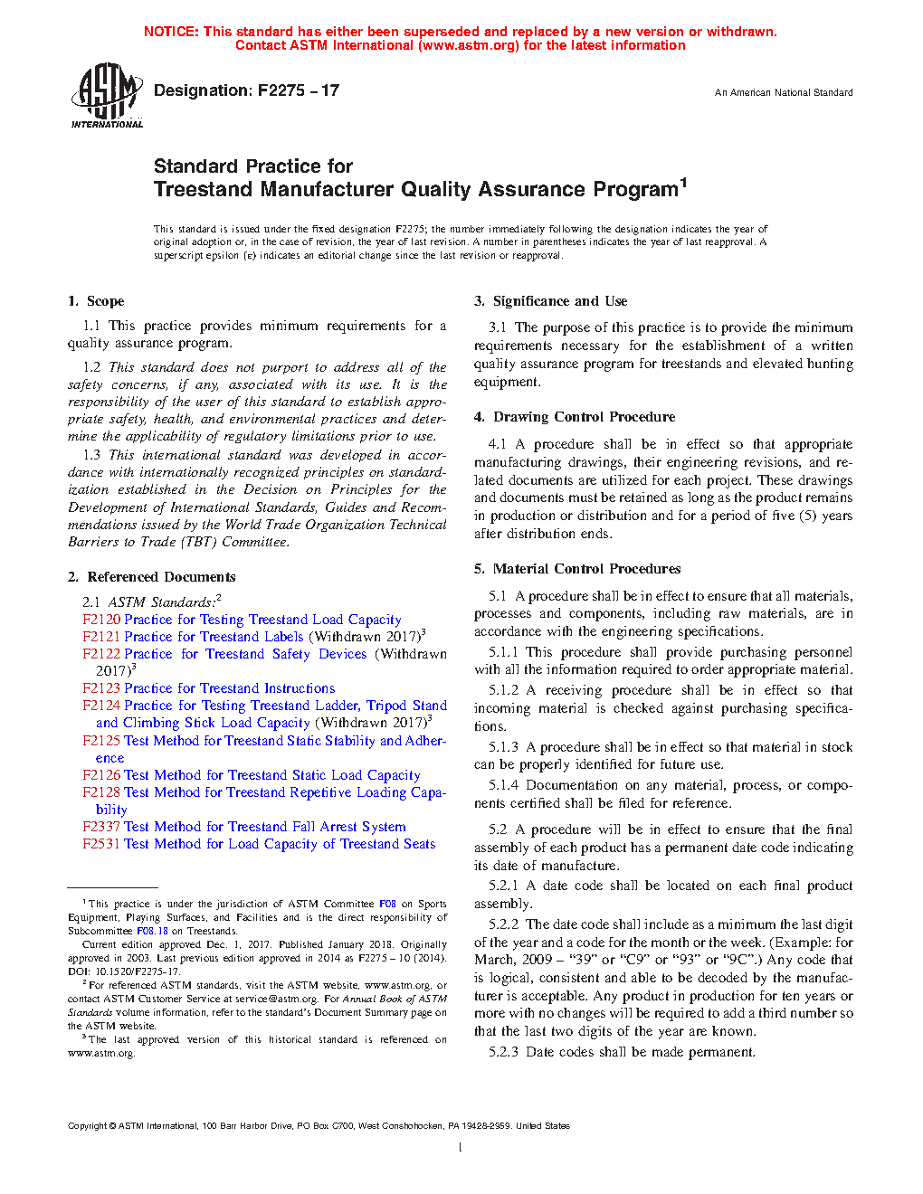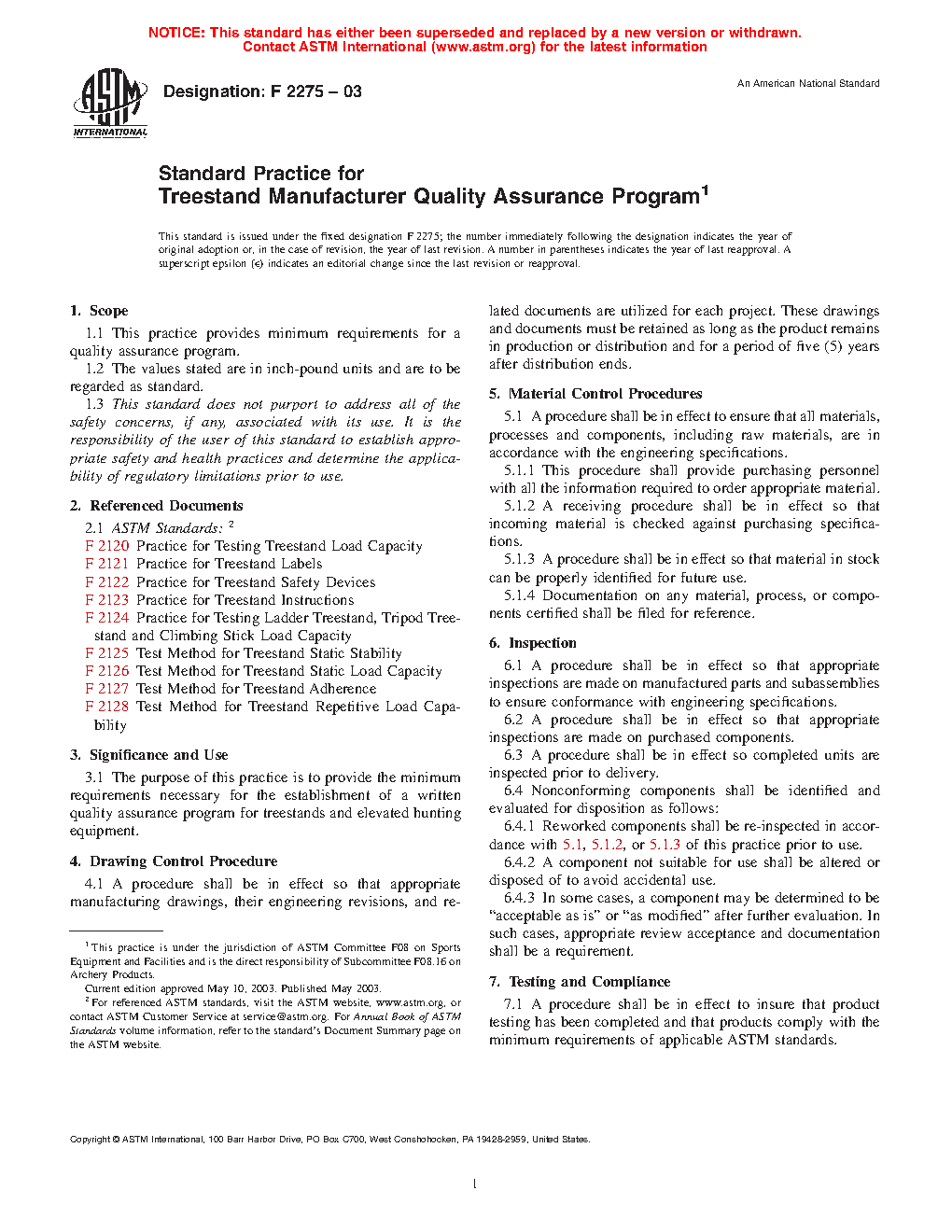 3.1 The purpose of this practice is to provide the minimum requirements necessary for the establishment of a written quality assurance program for treestands and elevated hunting equipment.