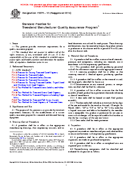 The purpose of this practice is to provide the minimum requirements necessary for the establishment of a written quality assurance program for treestands and elevated hunting equipment.