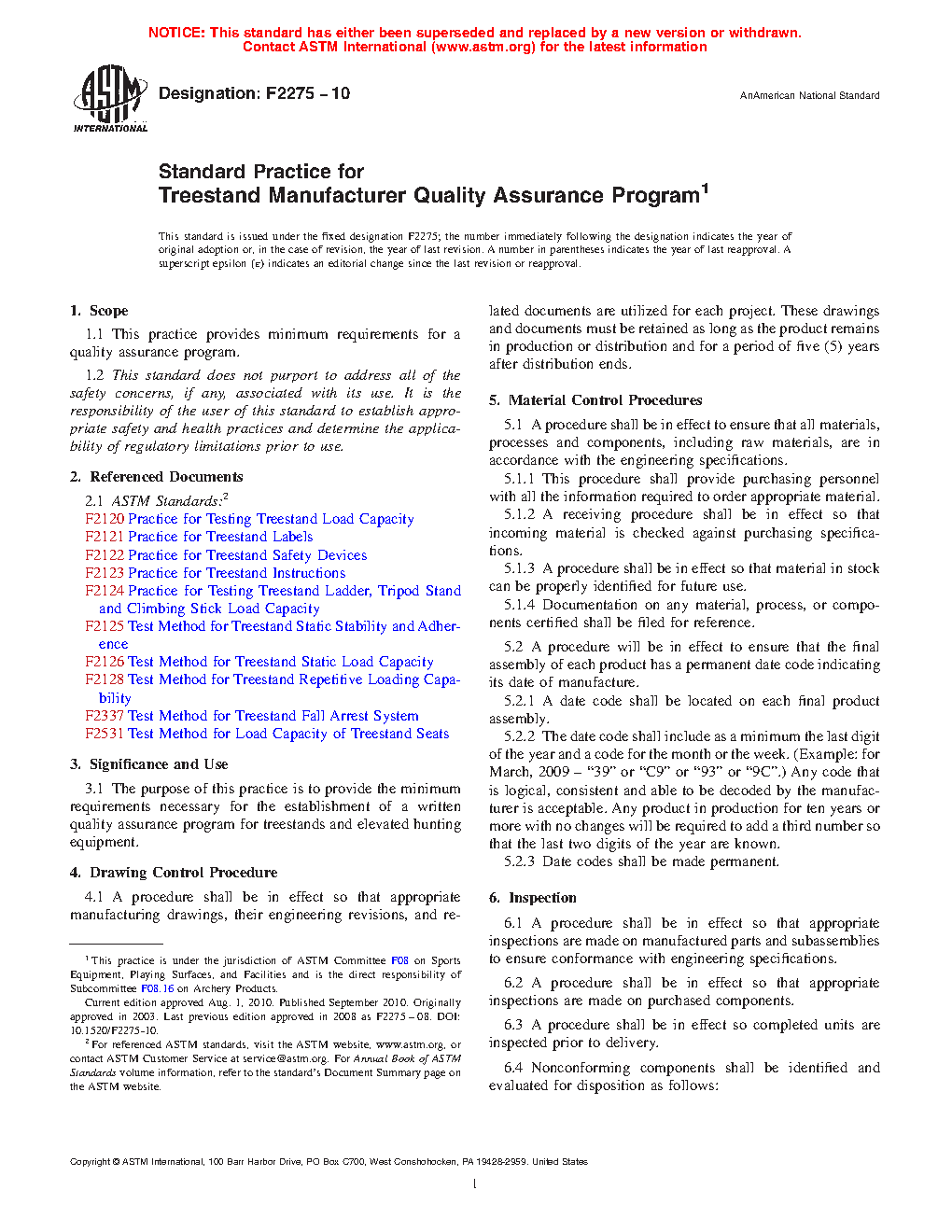 3.1 The purpose of this practice is to provide the minimum requirements necessary for the establishment of a written quality assurance program for treestands and elevated hunting equipment.
