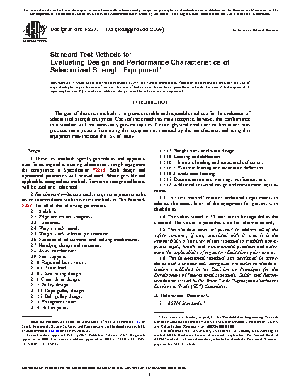 1.1 These test methods specify procedures and apparatus used for testing and evaluating selectorized strength equipment for compliance to Specification F2216. Both design and operational parameters will be evaluated. Where possible and applicable, accepted test methods from other recognized bodies will be used and referenced.