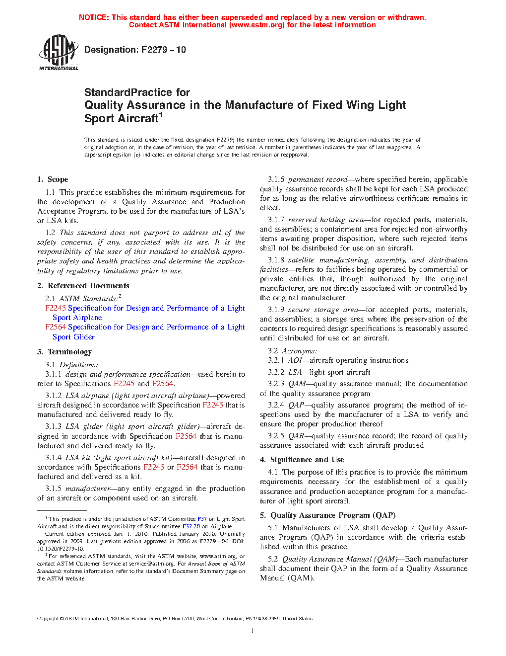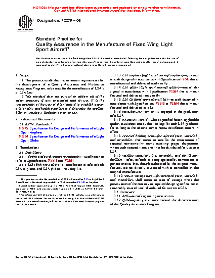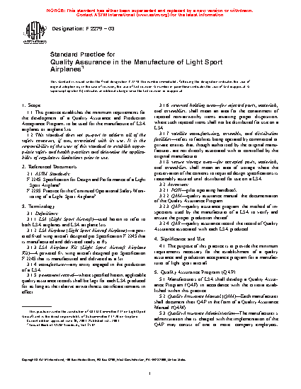 Standard Practice for Quality Assurance in the Manufacture of Fixed Wing Light Sport Aircraft
