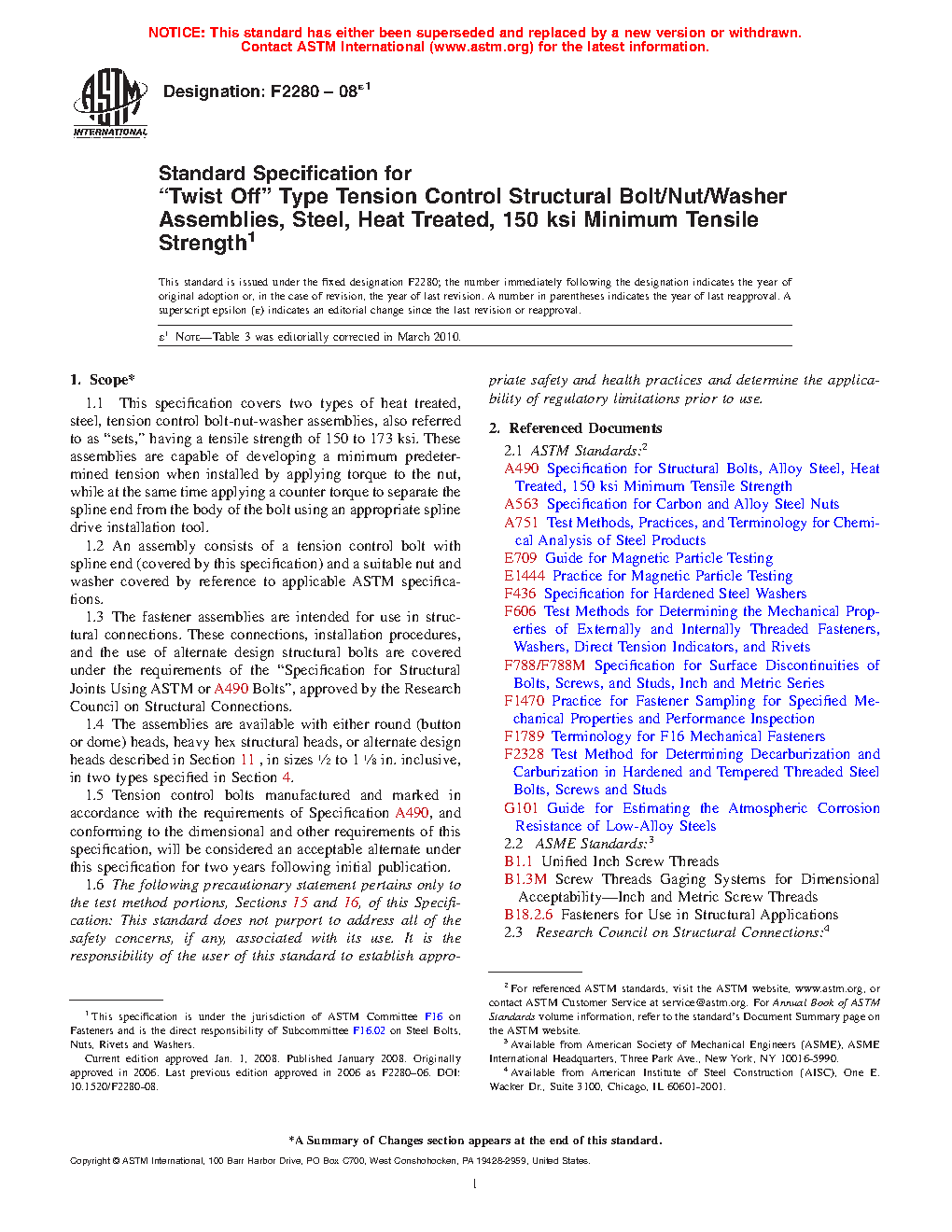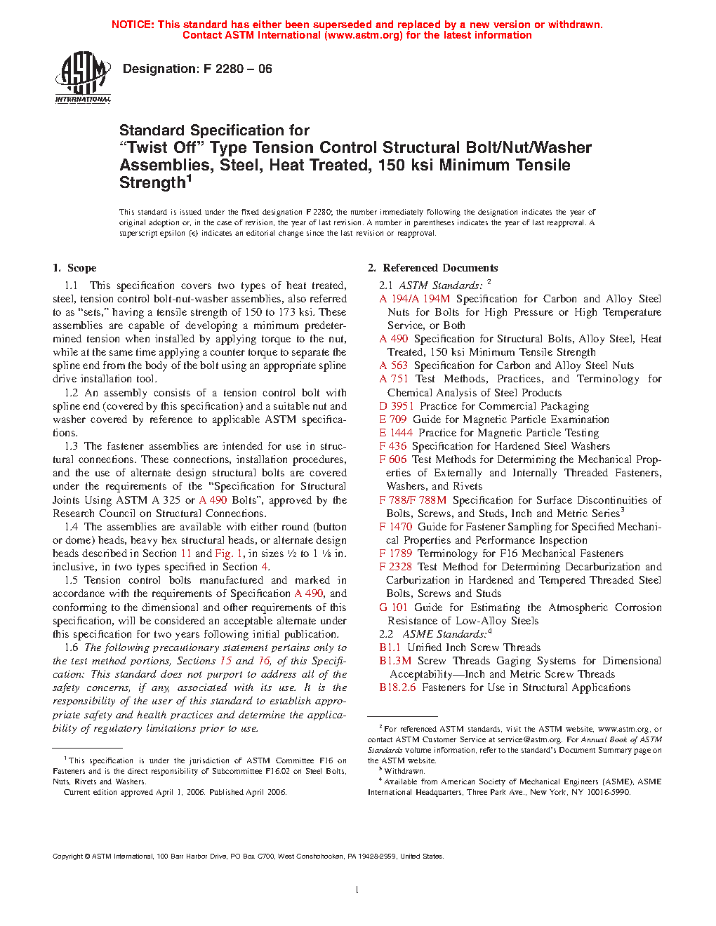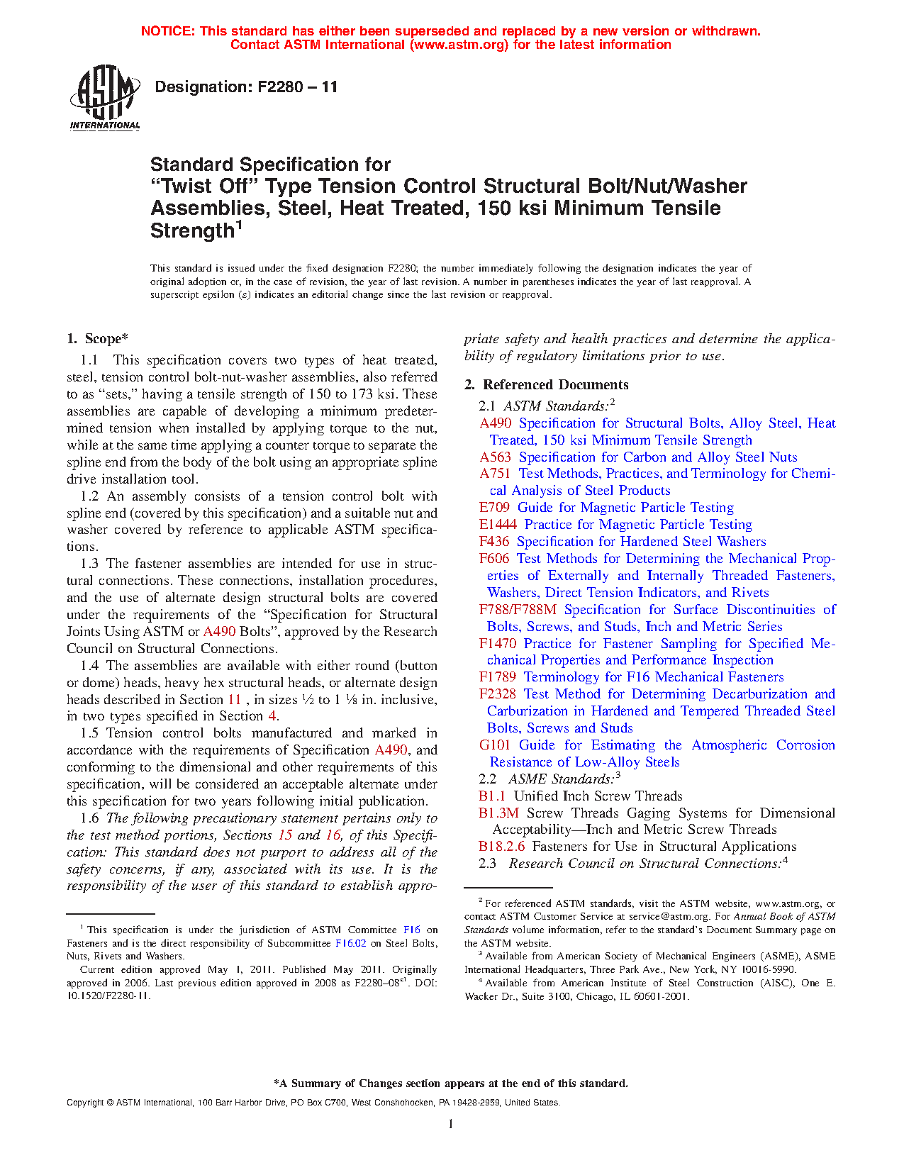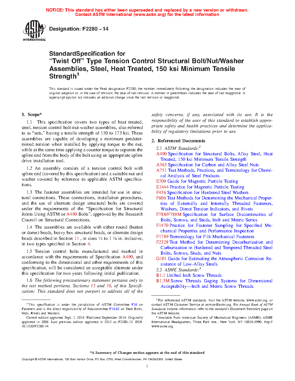 1.1 This specification covers two types of heat treated, steel, tension control bolt-nut-washer assemblies, also referred to as “sets,” having a tensile strength of 150 to 173 ksi. These assemblies are capable of developing a minimum predetermined tension when installed by applying torque to the nut, while at the same time applying a counter torque to separate the spline end from the body of the bolt using an appropriate spline drive installation tool.