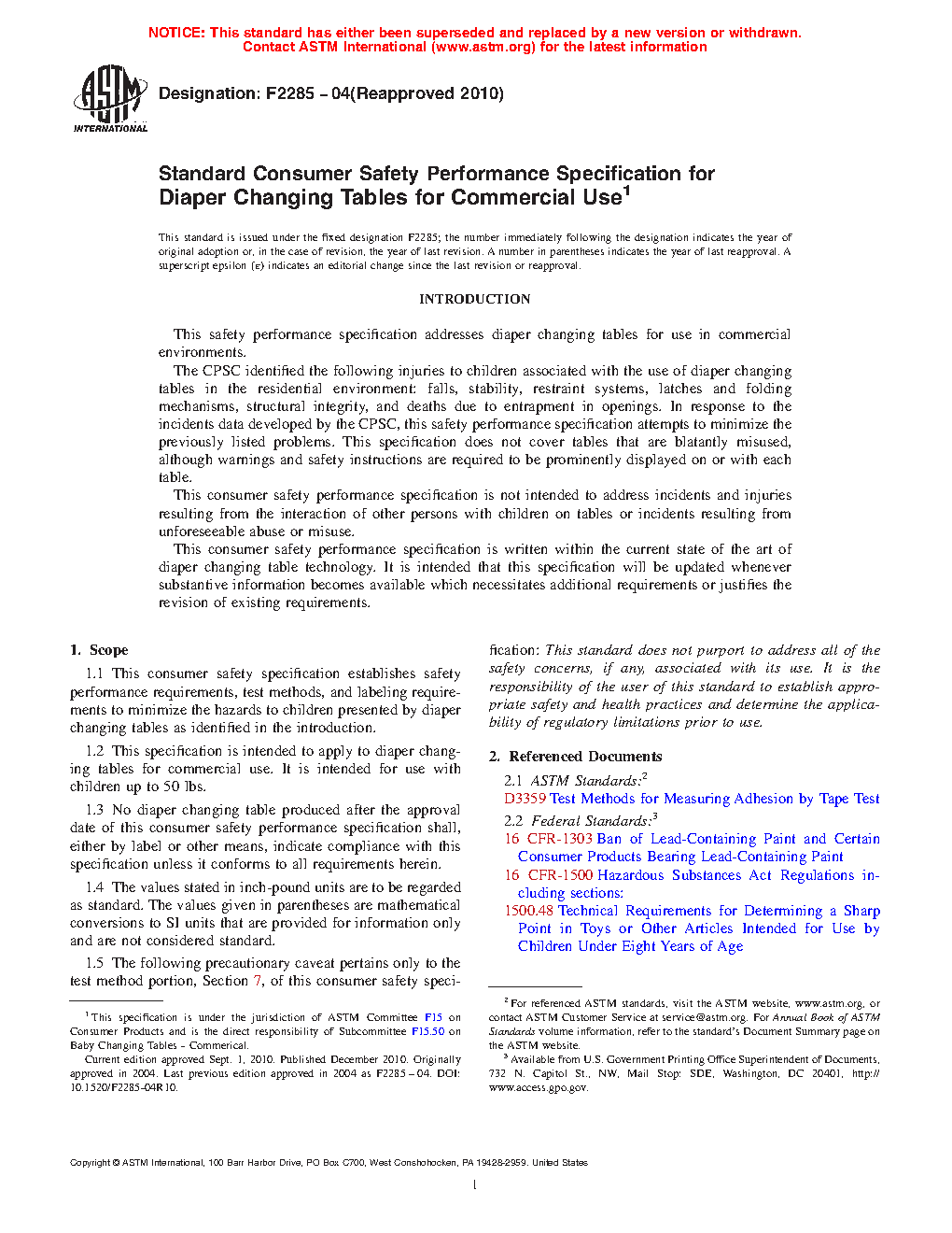 1.1 This consumer safety specification establishes safety performance requirements, test methods, and labeling requirements to minimize the hazards to children presented by diaper changing tables as identified in the introduction.