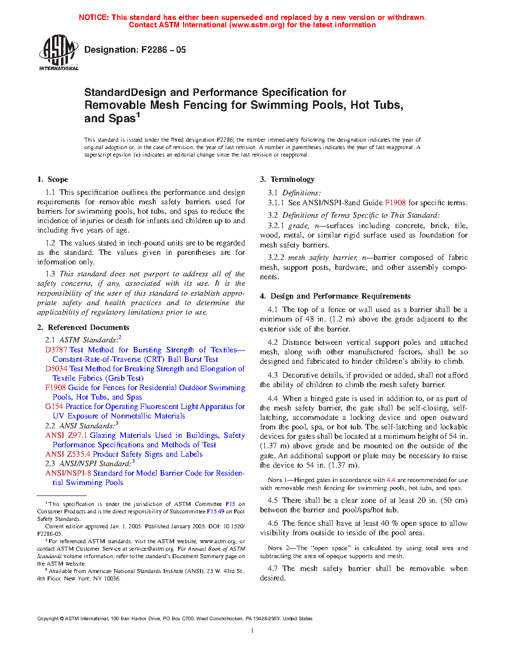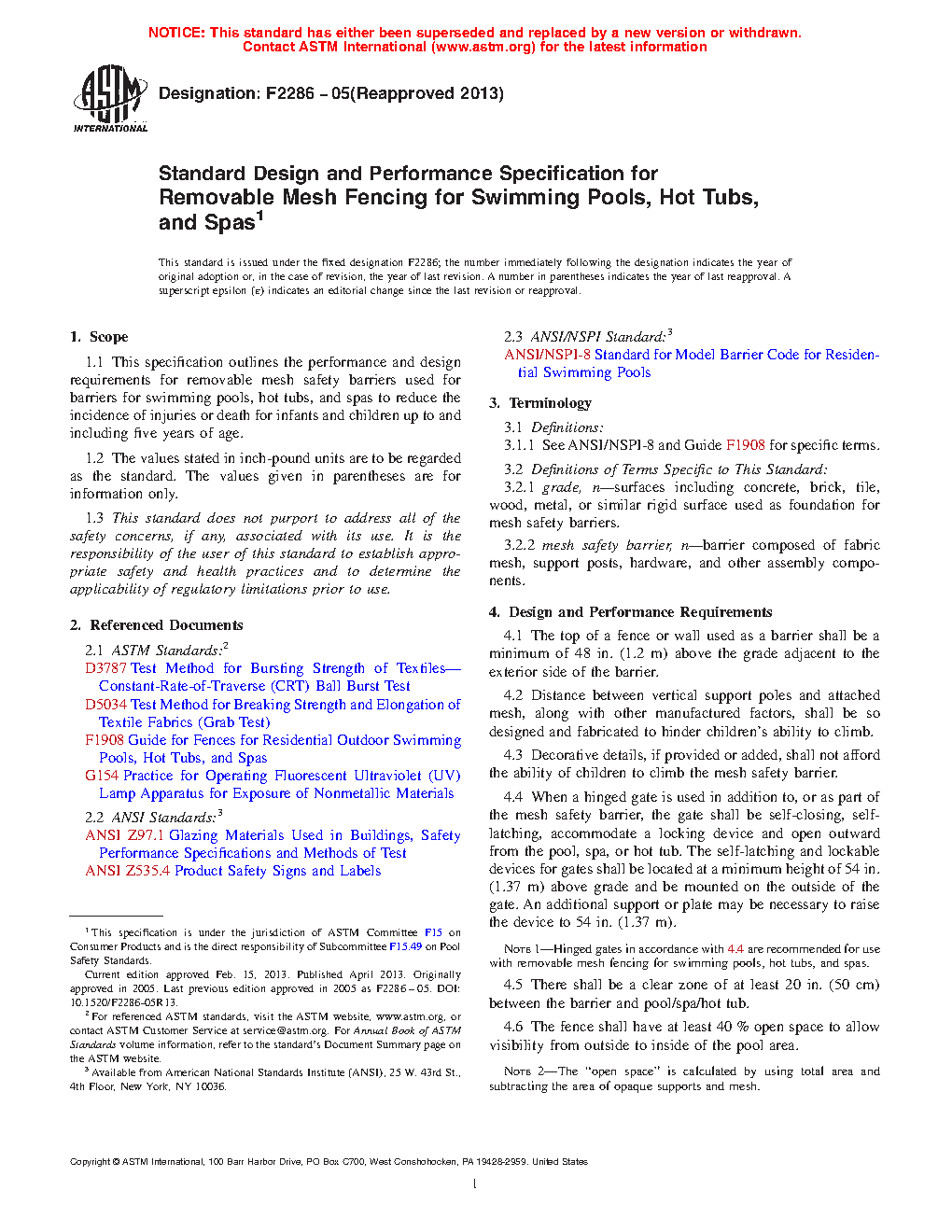 Standard Design and Performance Specification for Removable Mesh Fencing for Swimming Pools, Hot Tubs, and Spas