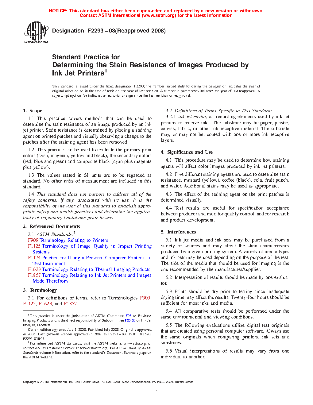 1.1 This practice covers methods that can be used to determine the stain resistance of an image produced by an ink jet printer. Stain resistance is determined by placing a staining agent on printed patches and visually observing a change to the patches after the staining agent has been removed.