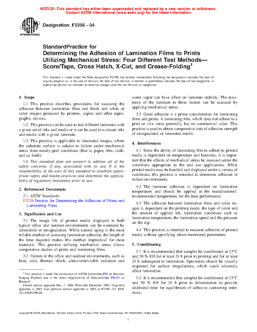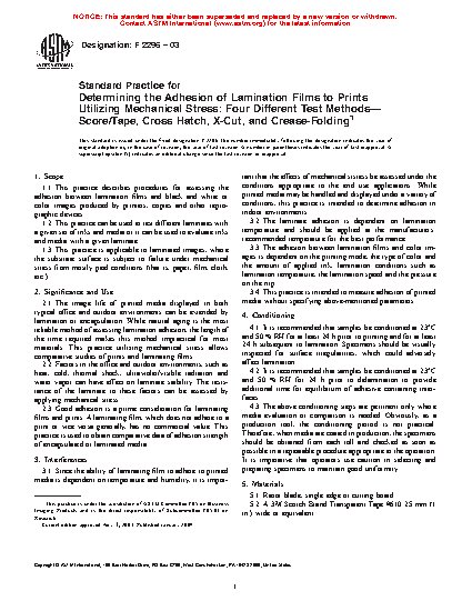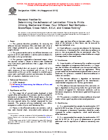 1.1 This practice describes procedures for assessing the adhesion between lamination films and black and white or color images produced by printers, copies and other reprographic devices.
