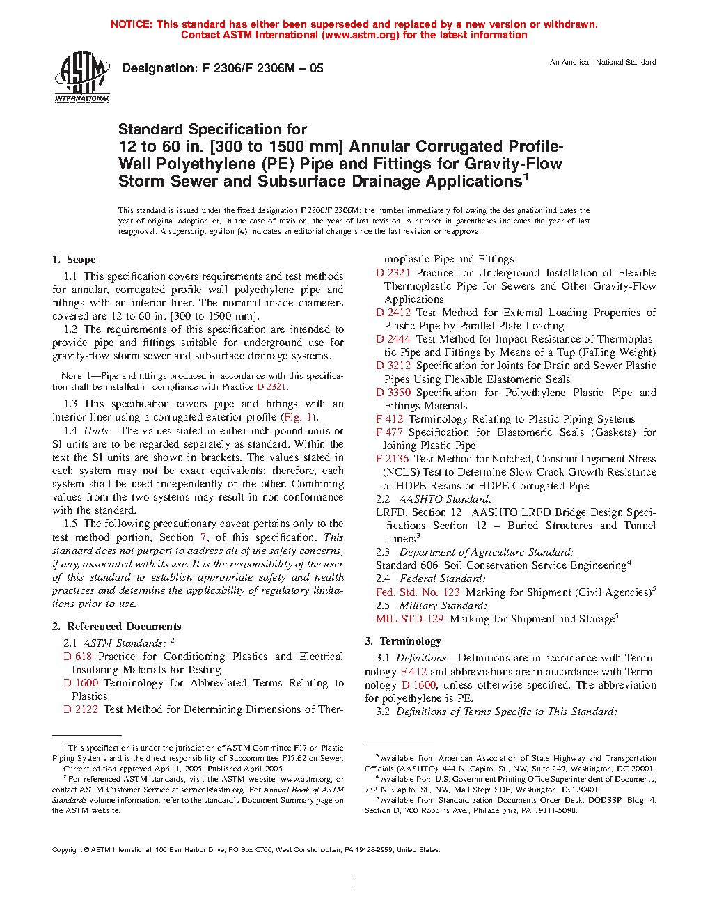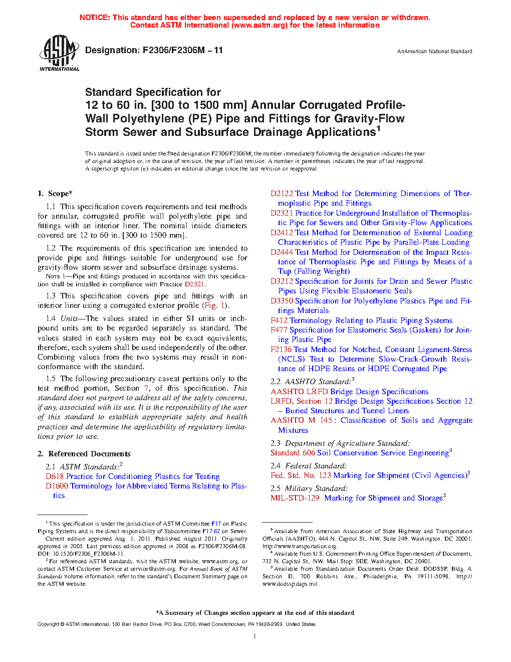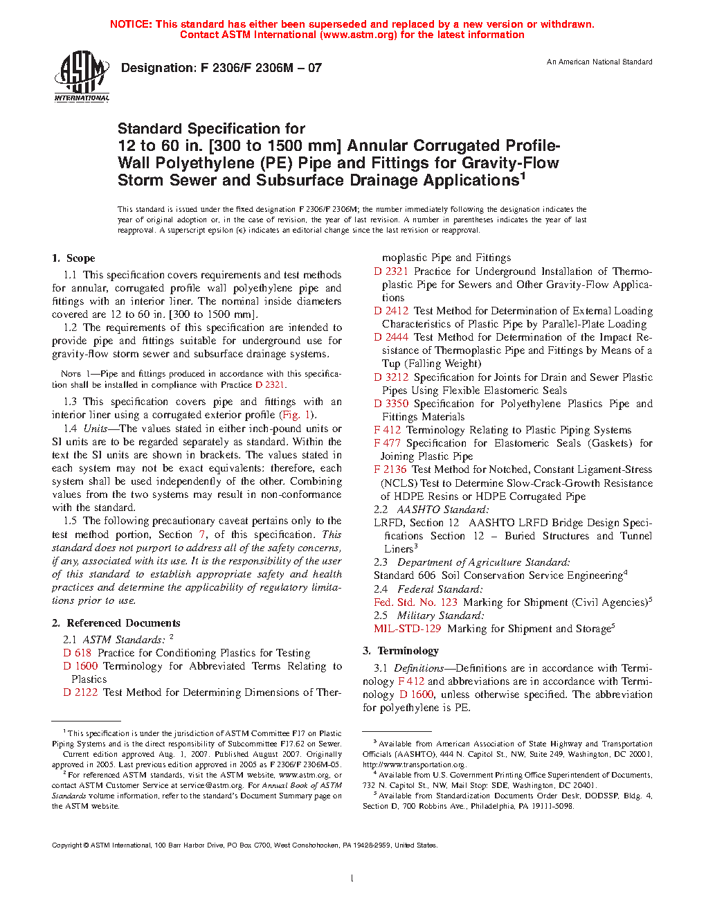 Note 1: Pipe and fittings produced in accordance with this specification shall be installed in compliance with Practice D2321.