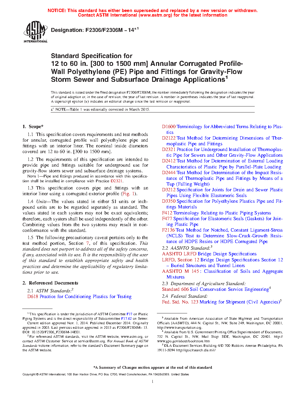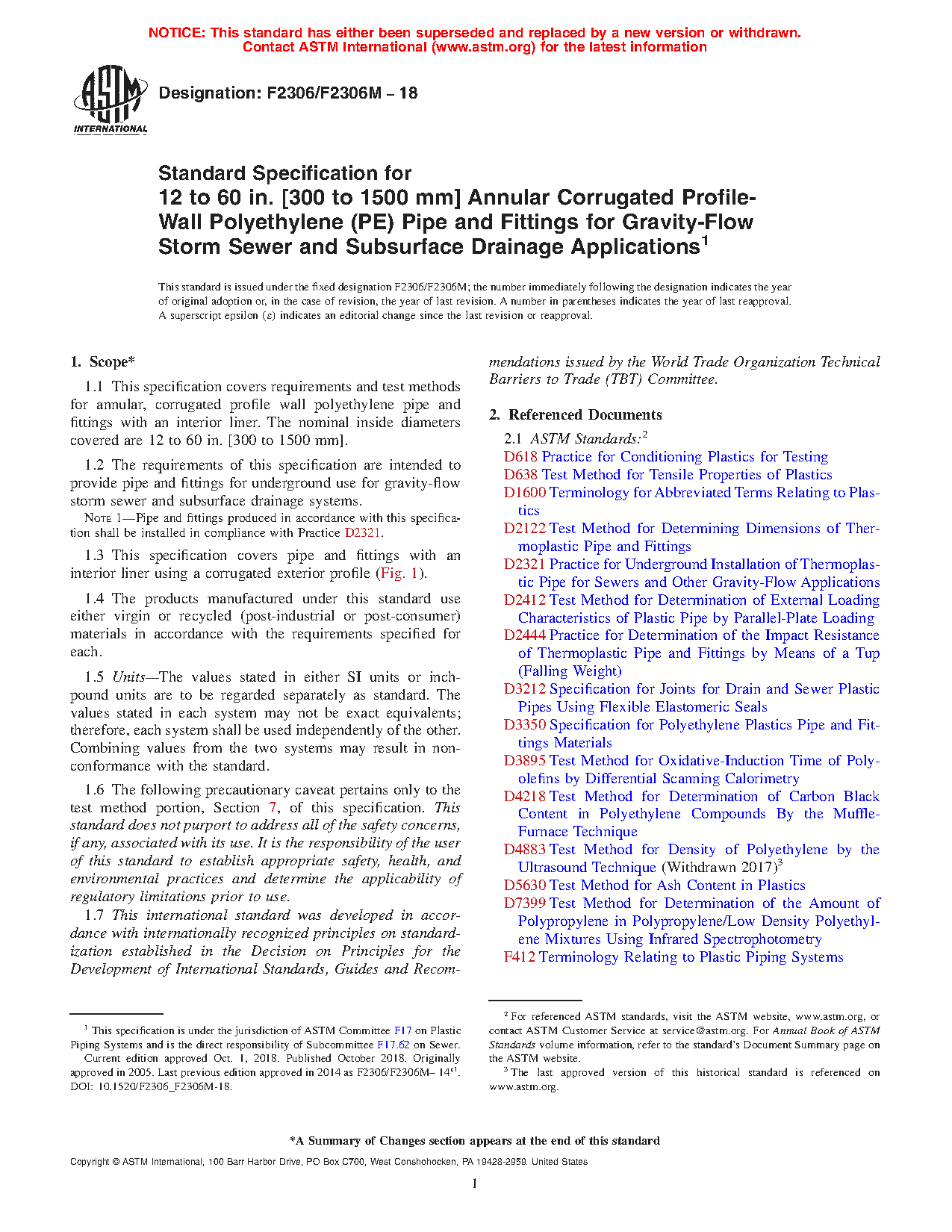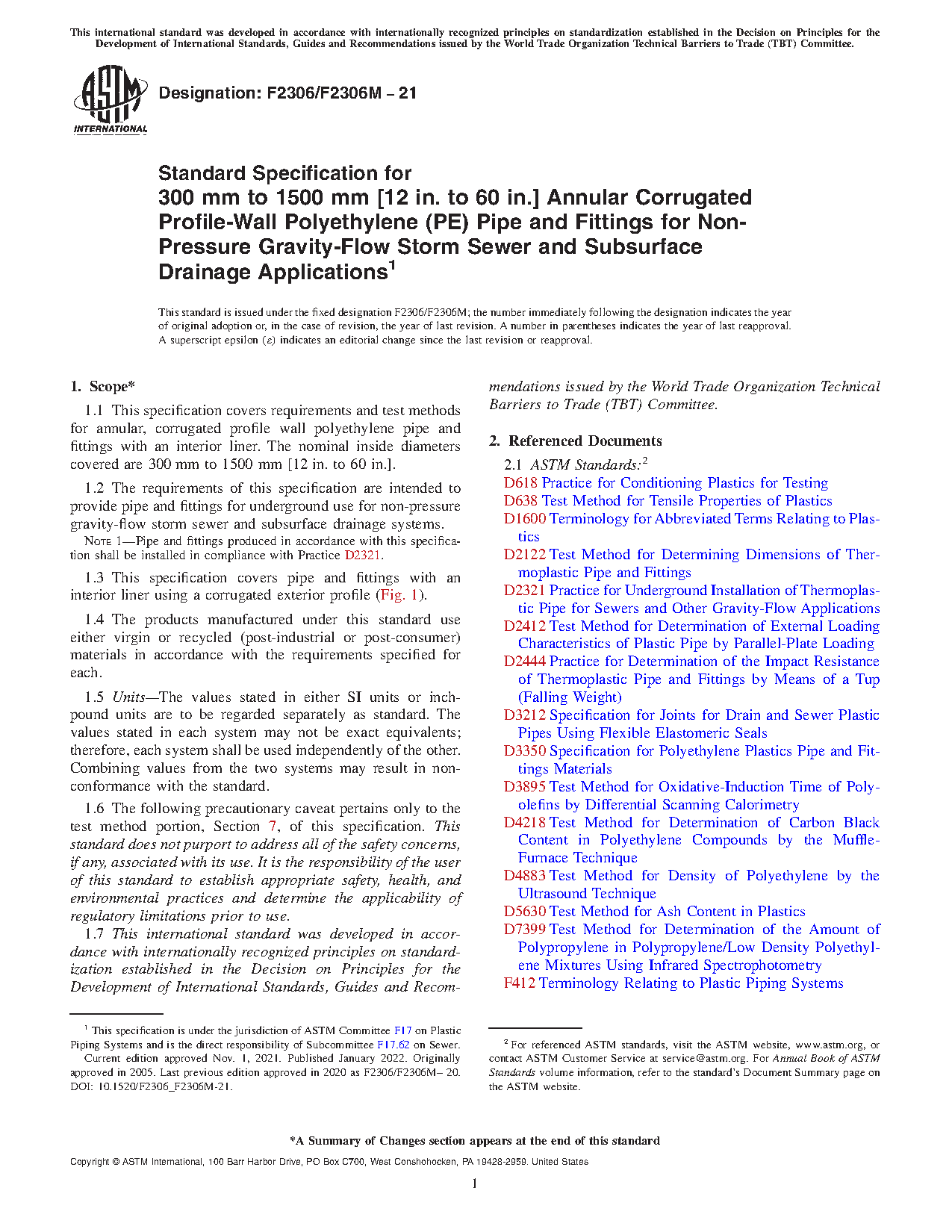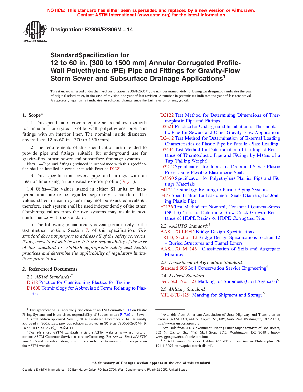 Note 1: Pipe and fittings produced in accordance with this specification shall be installed in compliance with Practice D2321.